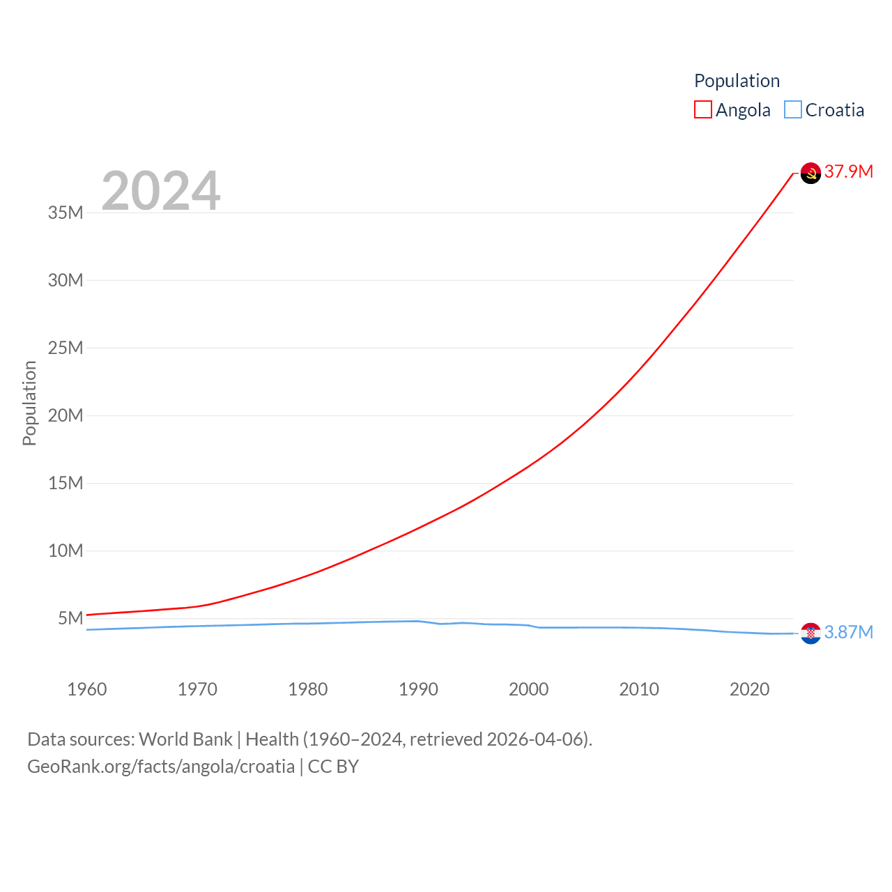 Angola has a population of 37.9M (ranked 40/197), compared with 3.87M in Croatia (ranked 129/197). Angola's land area is 481,354 sq mi versus 21,606 sq mi for Croatia (ranked 22nd vs. 123rd).