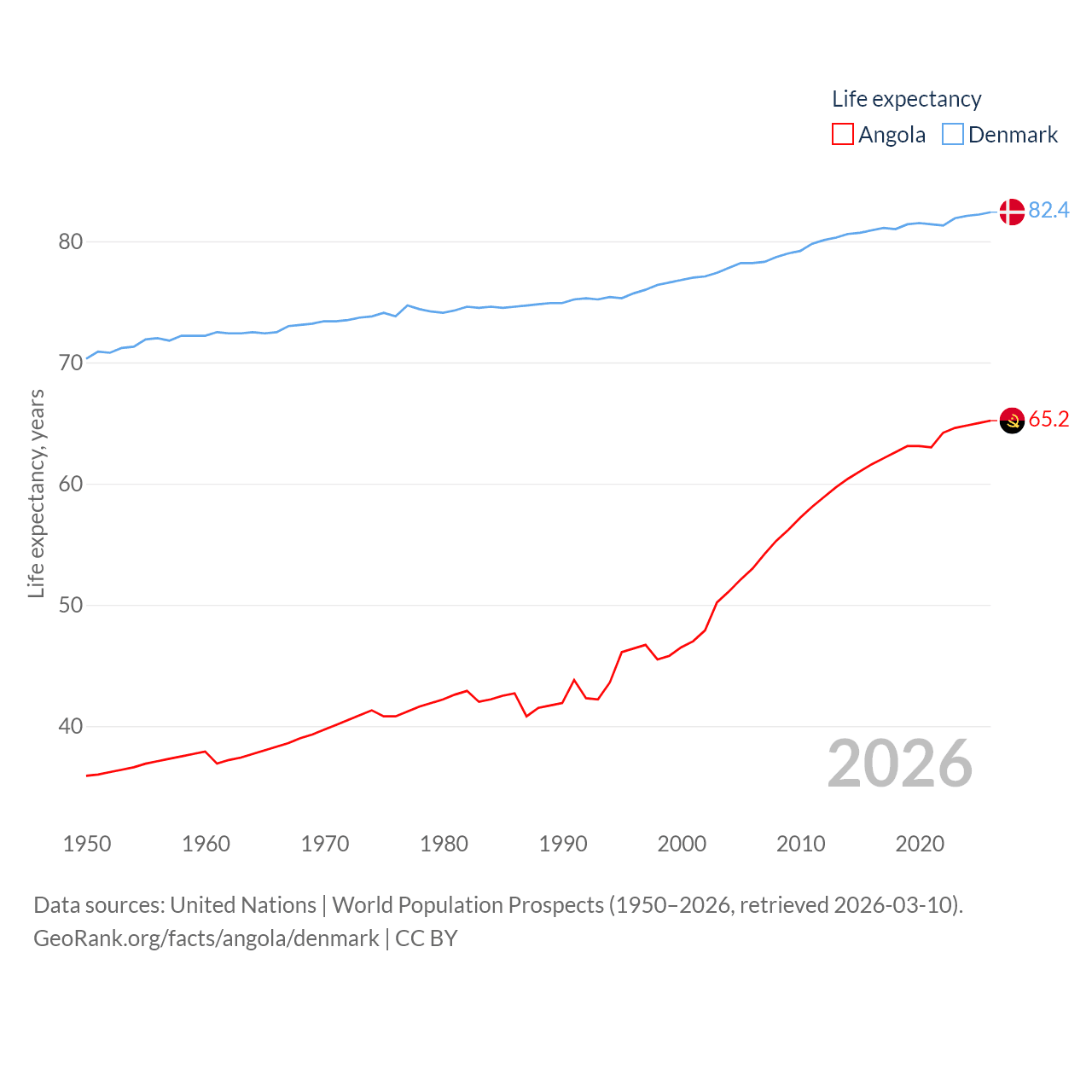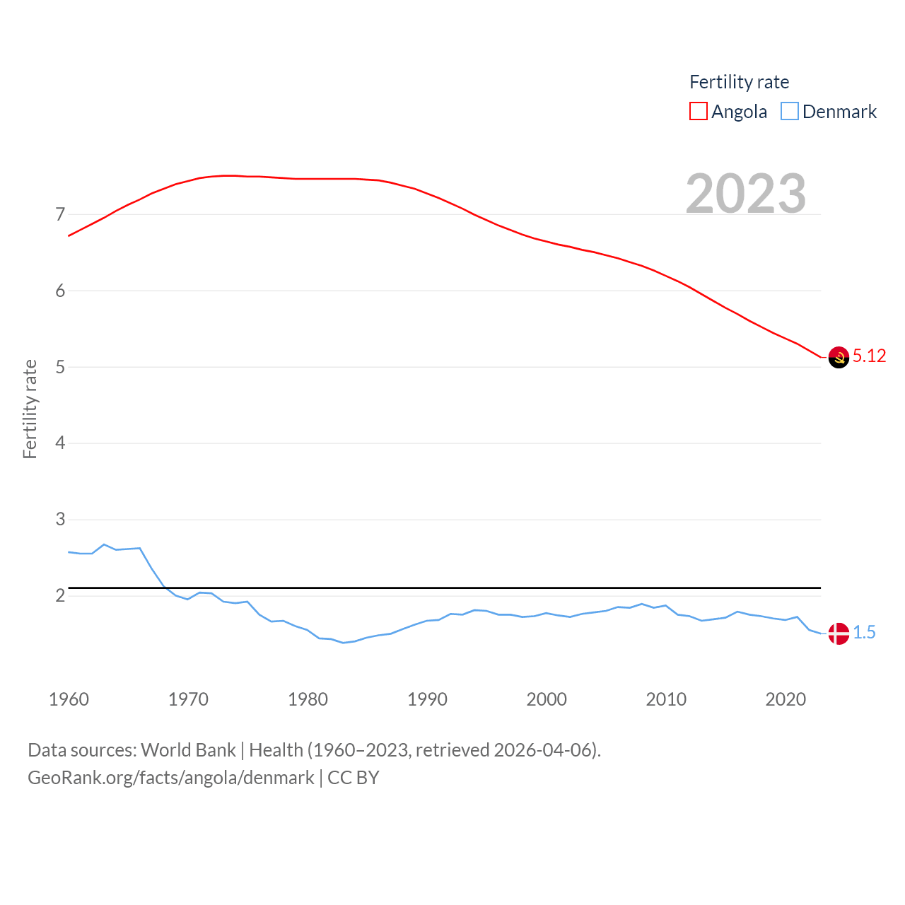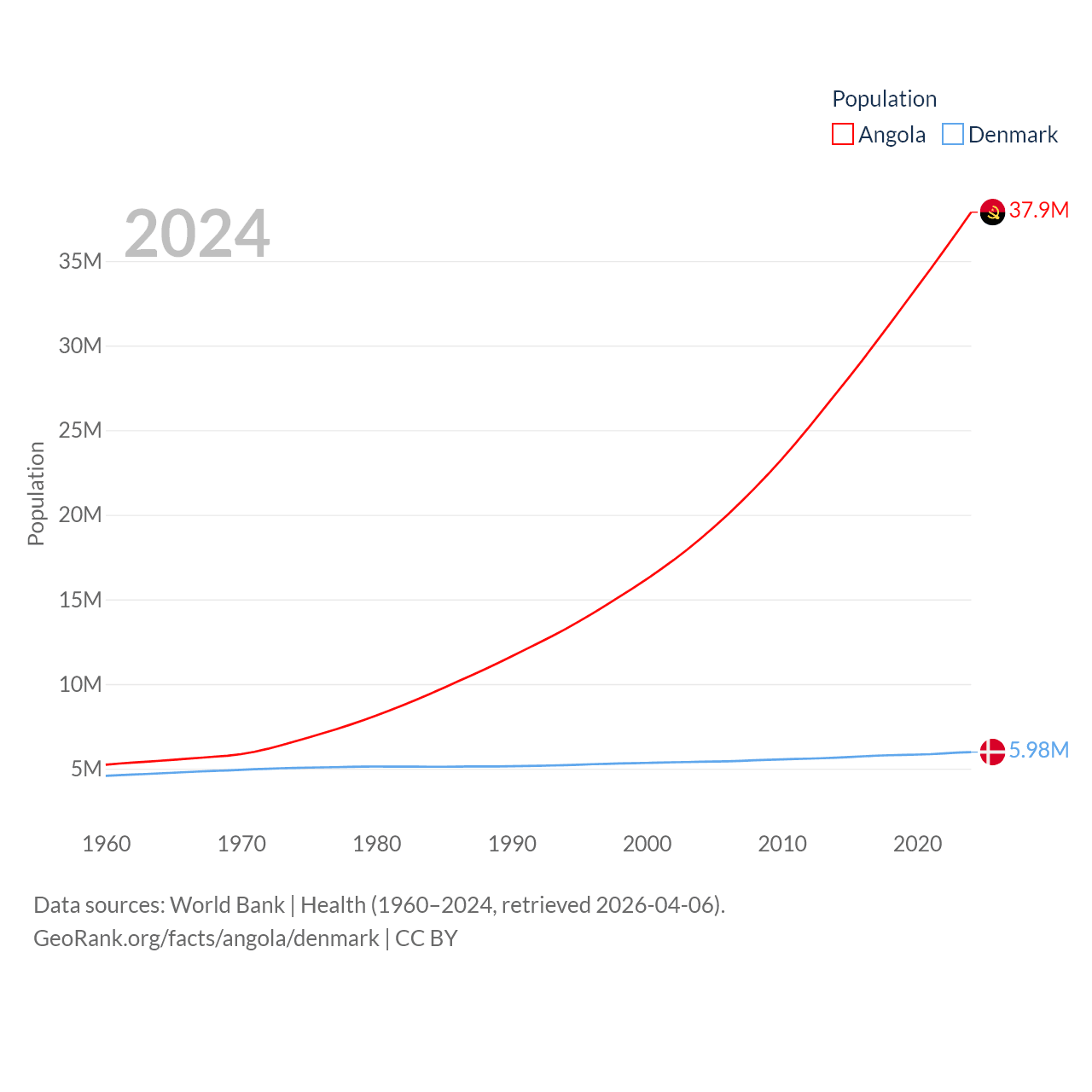 Angola has a population of 37.9M (ranked 40/197), compared with 5.98M in Denmark (ranked 114/197). Angola's land area is 481,354 sq mi versus 15,444 sq mi for Denmark (ranked 22nd vs. 130th).