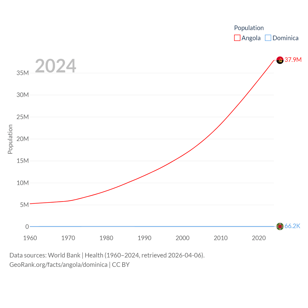 Angola has a population of 37.9M (ranked 40/197), compared with 66.2K in Dominica (ranked 188/197). Angola's land area is 481,354 sq mi versus 289.6 sq mi for Dominica (ranked 22nd vs. 175th).