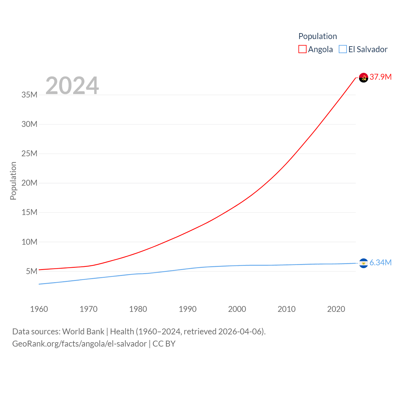 Angola has a population of 37.9M (ranked 40/197), compared with 6.34M in El Salvador (ranked 111/197). Angola's land area is 481,354 sq mi versus 8,000 sq mi for El Salvador (ranked 22nd vs. 150th).