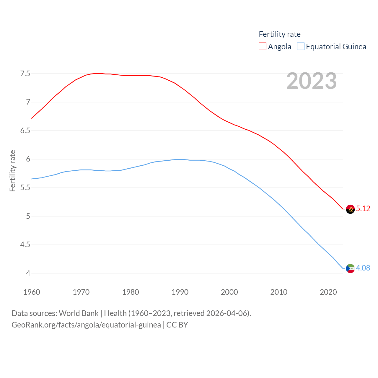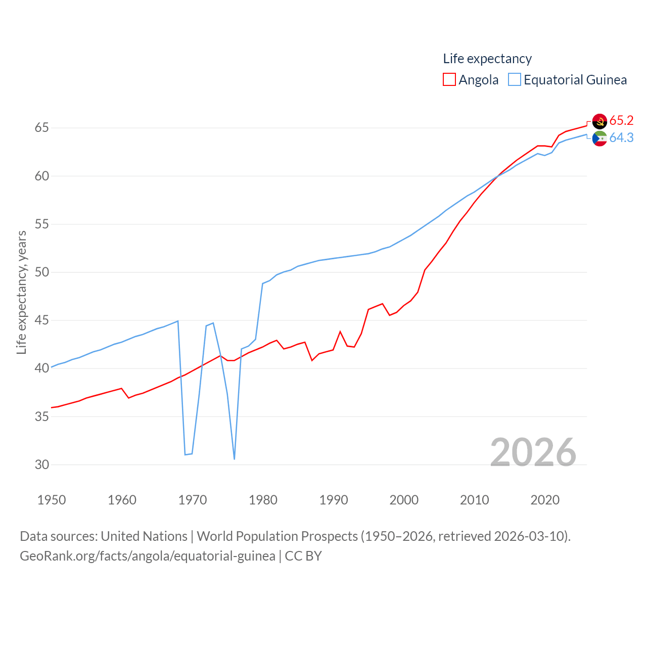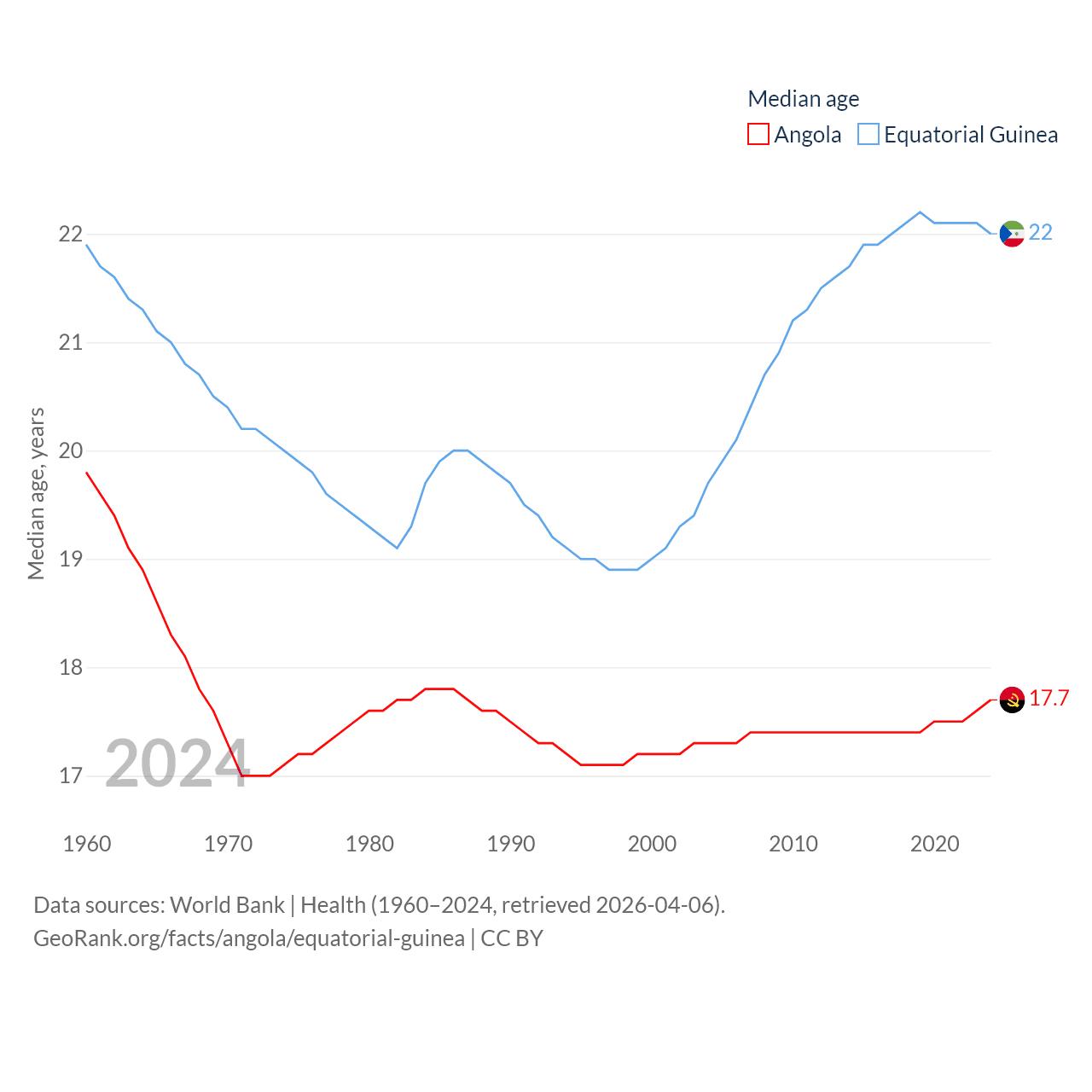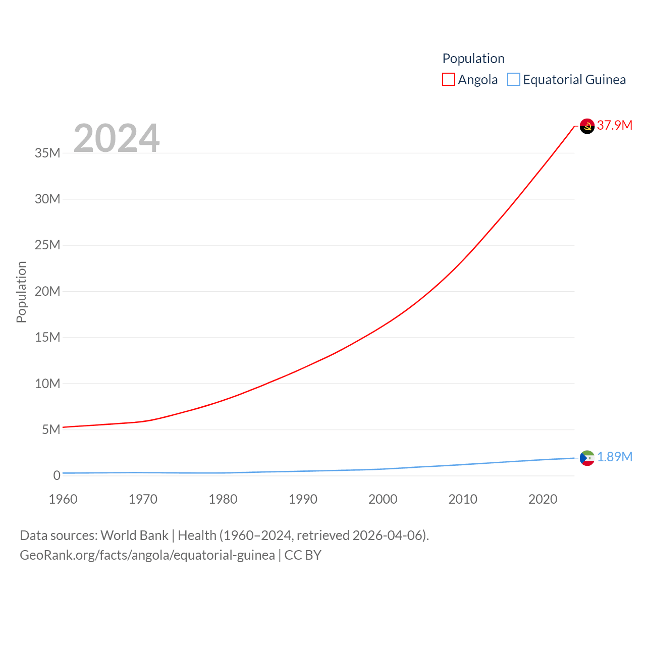 Angola has a population of 37.9M (ranked 40/197), compared with 1.89M in Equatorial Guinea (ranked 148/197). Angola's land area is 481,354 sq mi versus 10,830 sq mi for Equatorial Guinea (ranked 22nd vs. 140th).