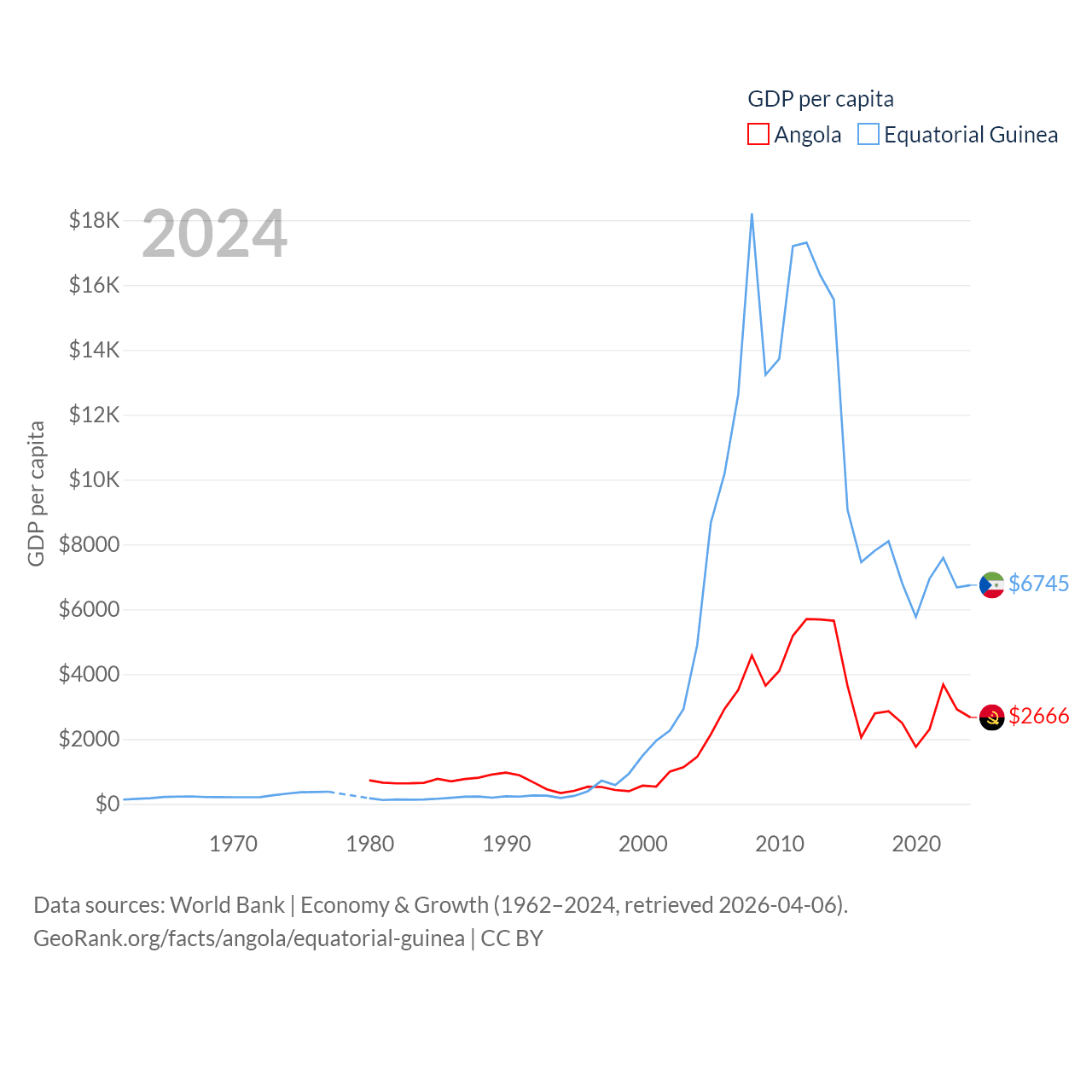 By GDP, Angola ranks 71/197 ($101B) and Equatorial Guinea ranks 148/197 ($12.8B). By GDP per capita, Angola ranks 144/197 ($2,666), while Equatorial Guinea ranks 106/197 ($6,745).