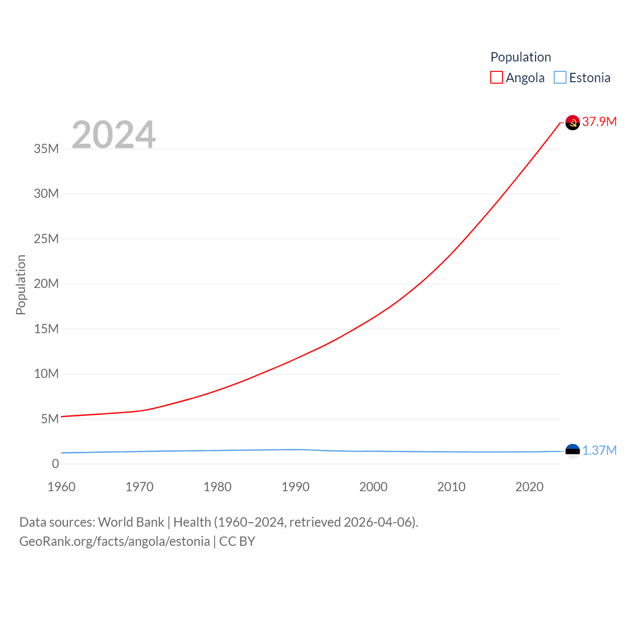 Angola has a population of 37.9M (ranked 40/197), compared with 1.37M in Estonia (ranked 153/197). Angola's land area is 481,354 sq mi versus 16,498 sq mi for Estonia (ranked 22nd vs. 129th).