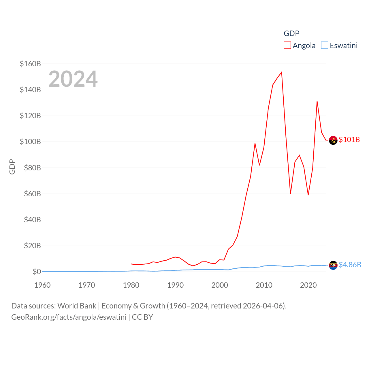 By GDP, Angola ranks 71/197 ($101B) and Eswatini ranks 162/197 ($4.86B). By GDP per capita, Angola ranks 144/197 ($2,666), while Eswatini ranks 131/197 ($3,910).