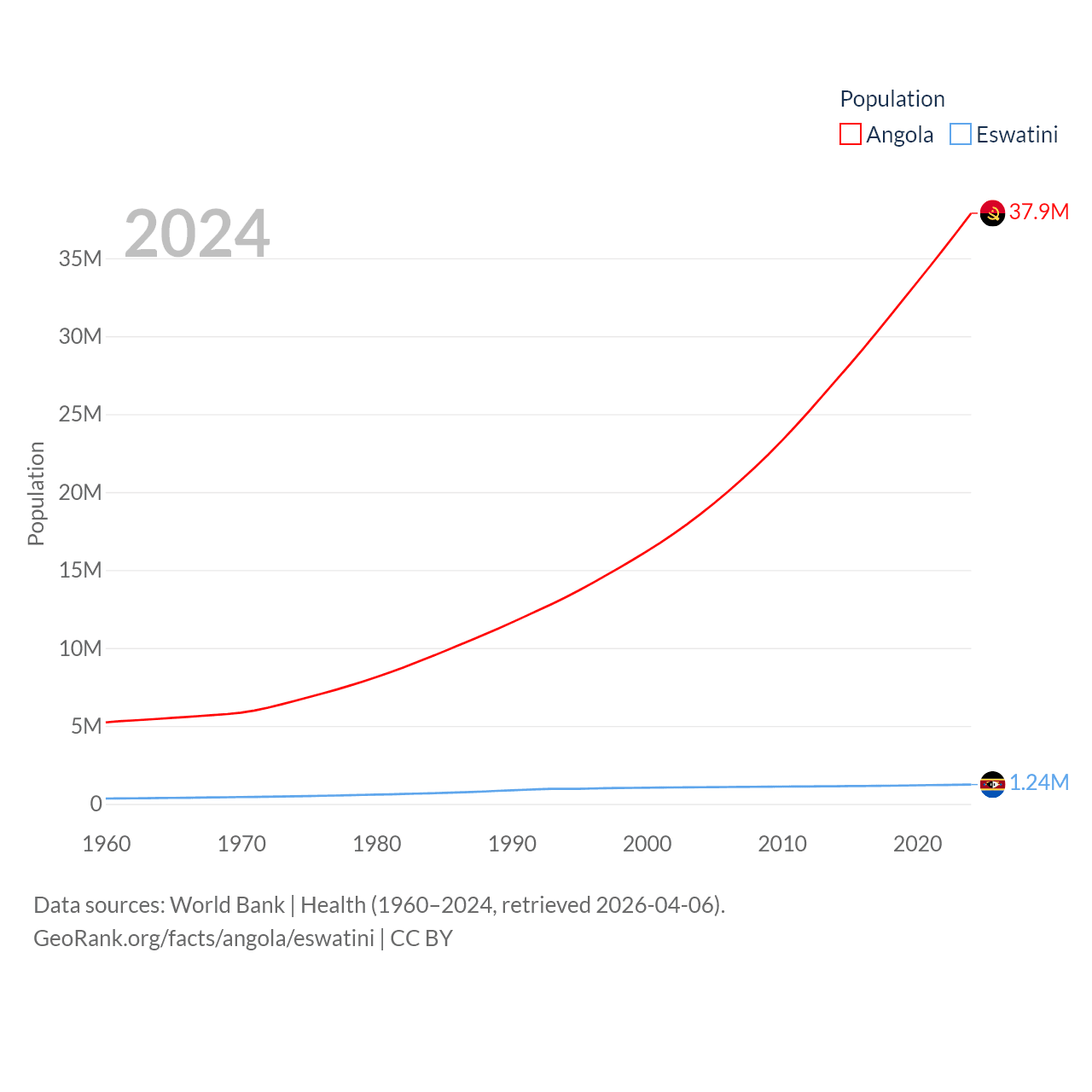 Angola has a population of 37.9M (ranked 40/197), compared with 1.24M in Eswatini (ranked 157/197). Angola's land area is 481,354 sq mi versus 6,641 sq mi for Eswatini (ranked 22nd vs. 154th).