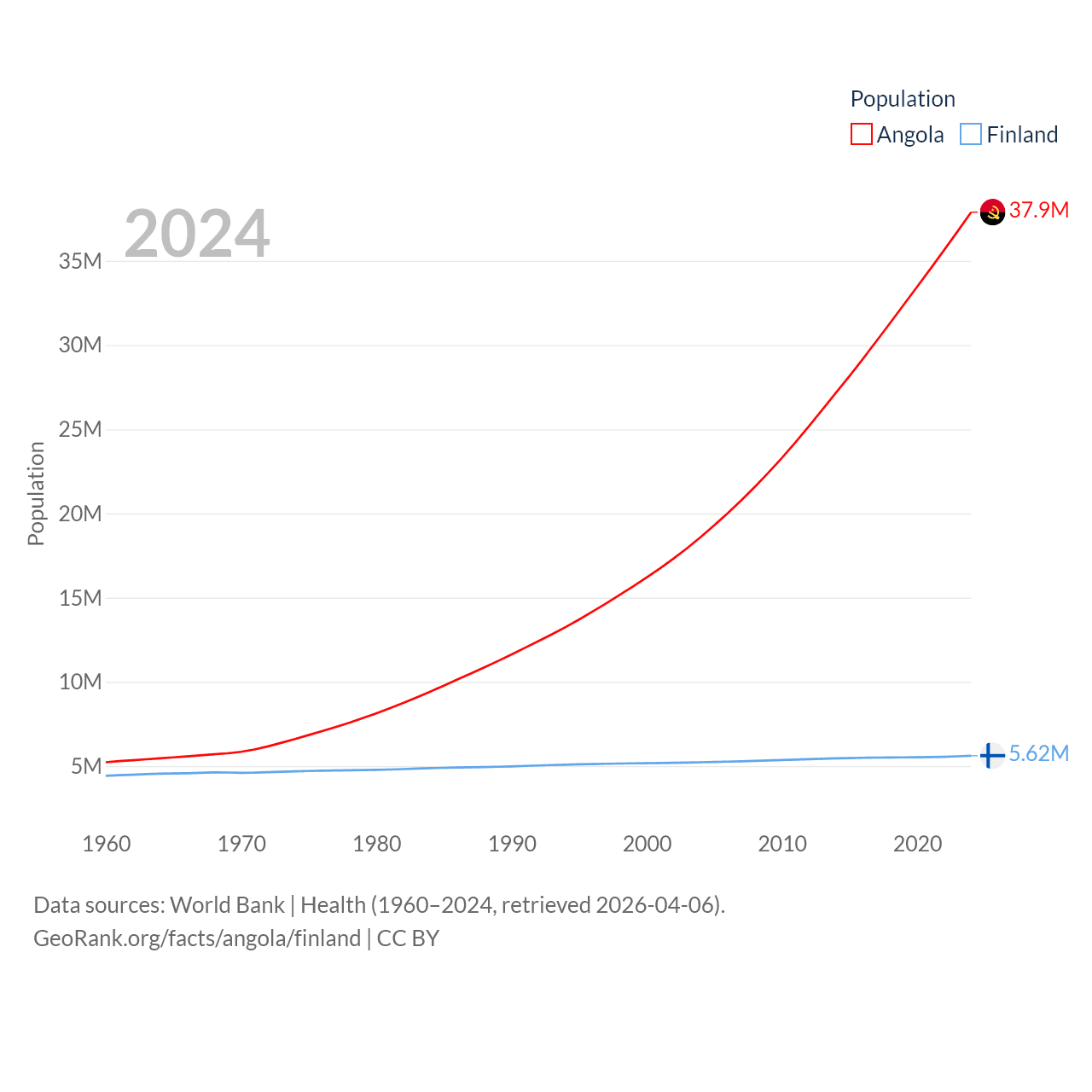 Angola has a population of 37.9M (ranked 40/197), compared with 5.62M in Finland (ranked 116/197). Angola's land area is 481,354 sq mi versus 117,360 sq mi for Finland (ranked 22nd vs. 70th).
