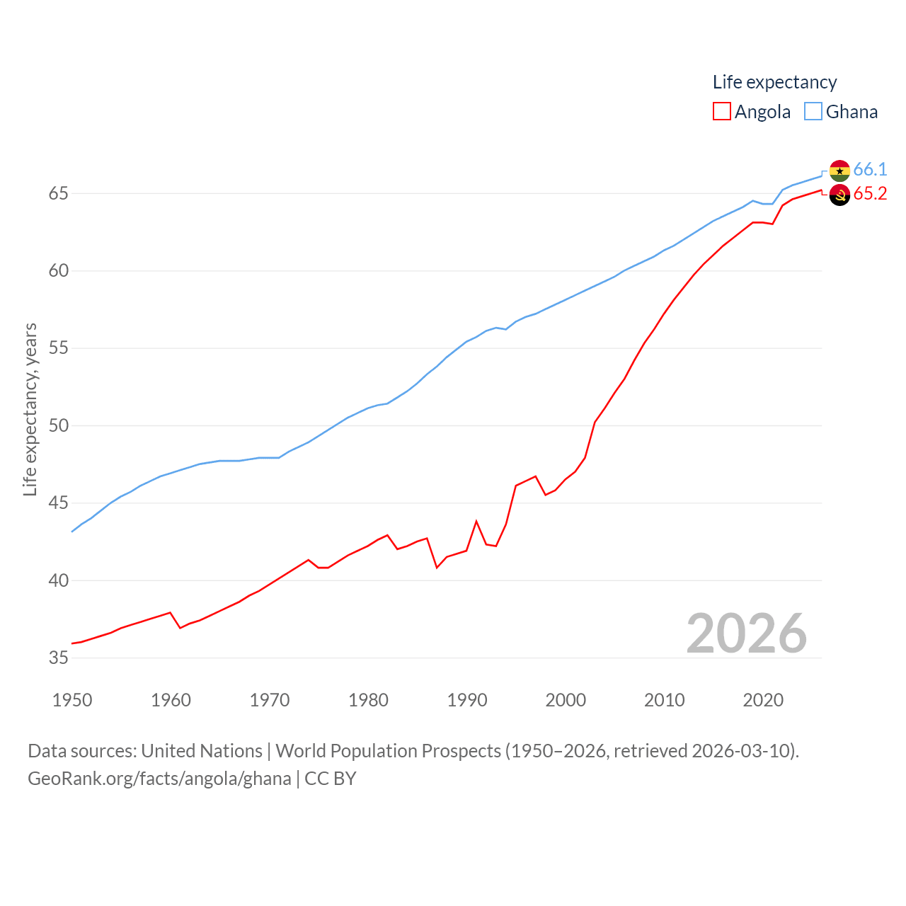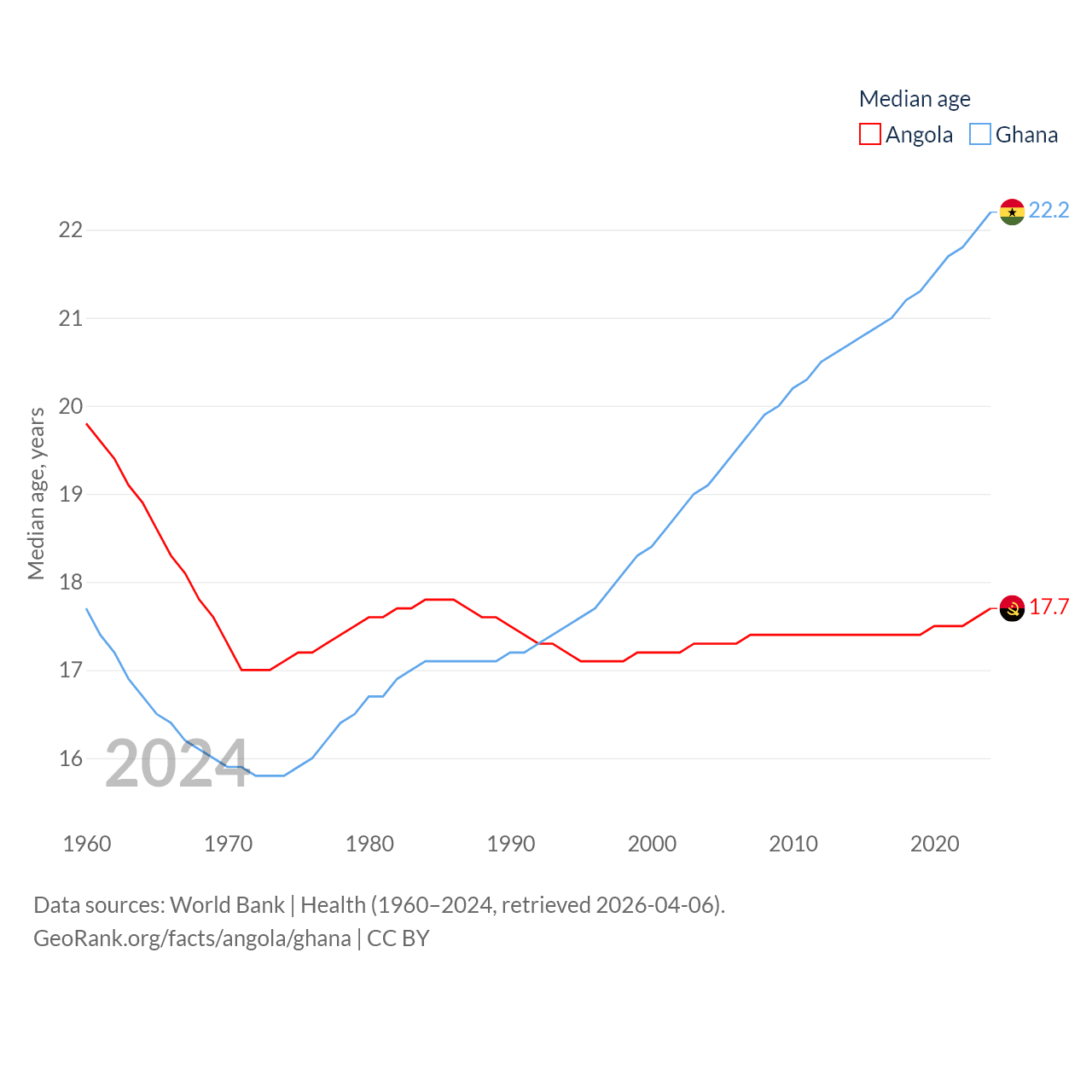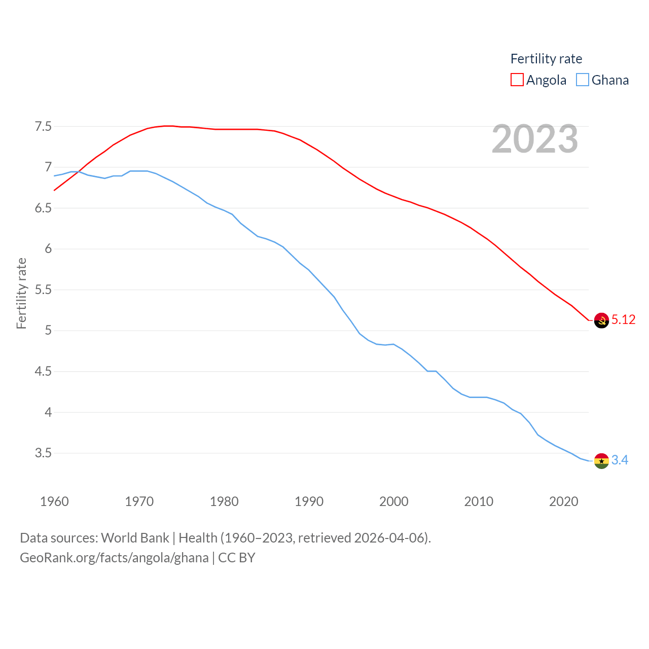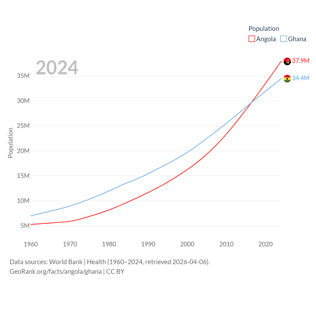Angola has a population of 37.9M (ranked 40/197), compared with 34.4M in Ghana (ranked 47/197). Angola's land area is 481,354 sq mi versus 87,851 sq mi for Ghana (ranked 22nd vs. 81st).