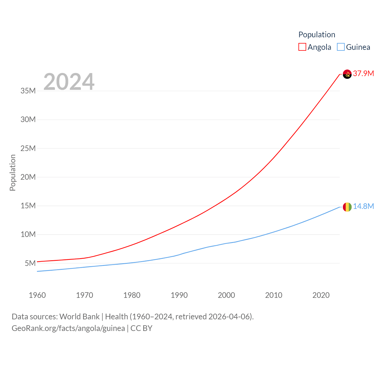 Angola has a population of 37.9M (ranked 40/197), compared with 14.8M in Guinea (ranked 75/197). Angola's land area is 481,354 sq mi versus 94,873 sq mi for Guinea (ranked 22nd vs. 77th).
