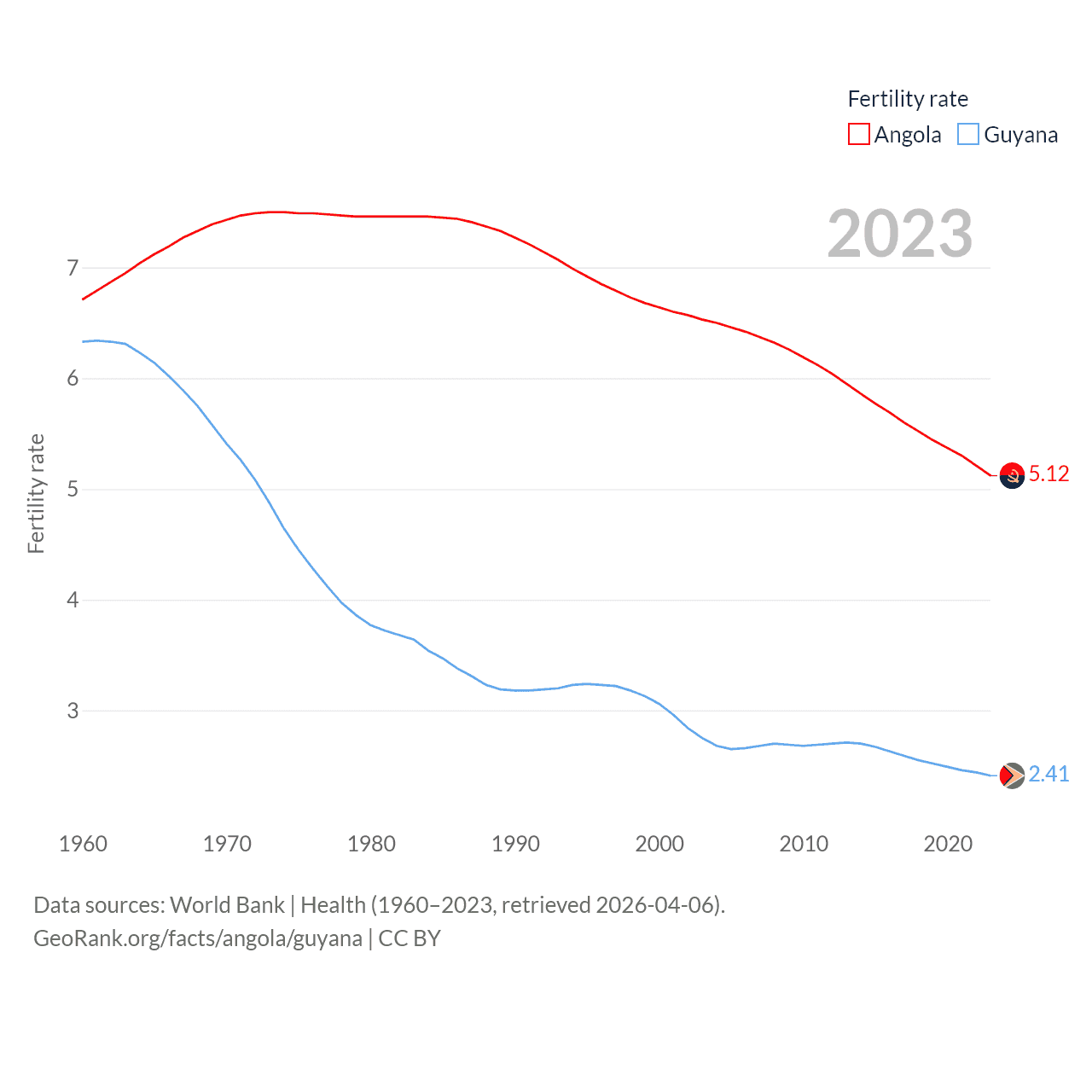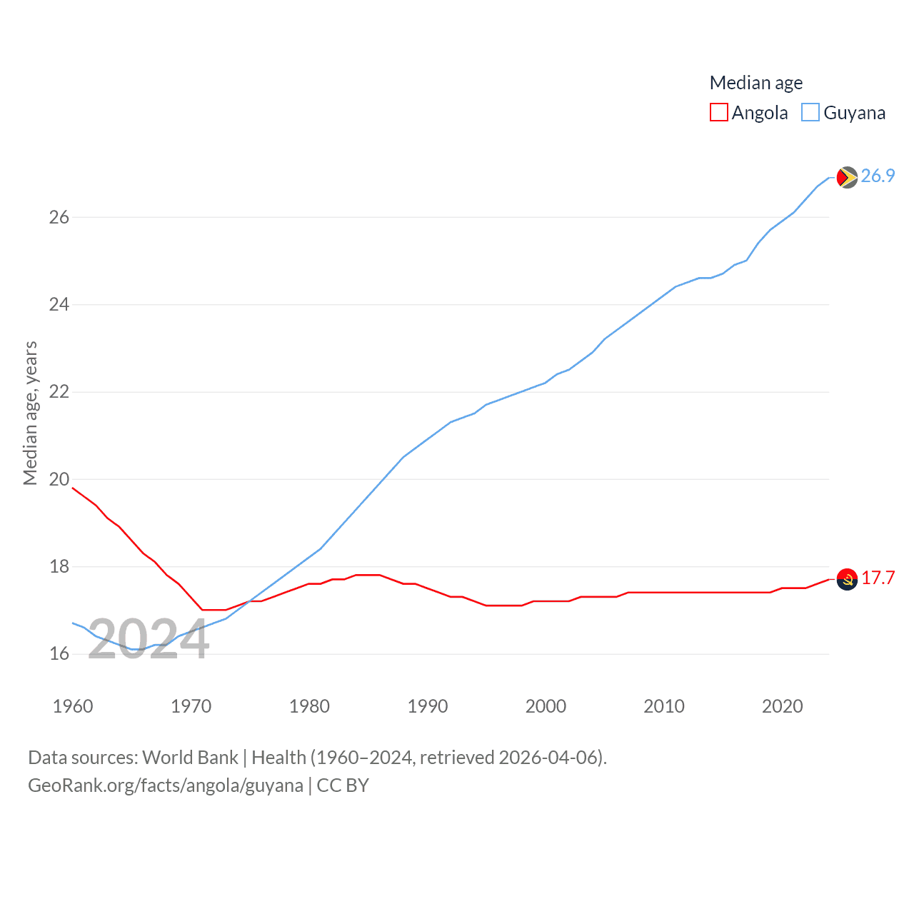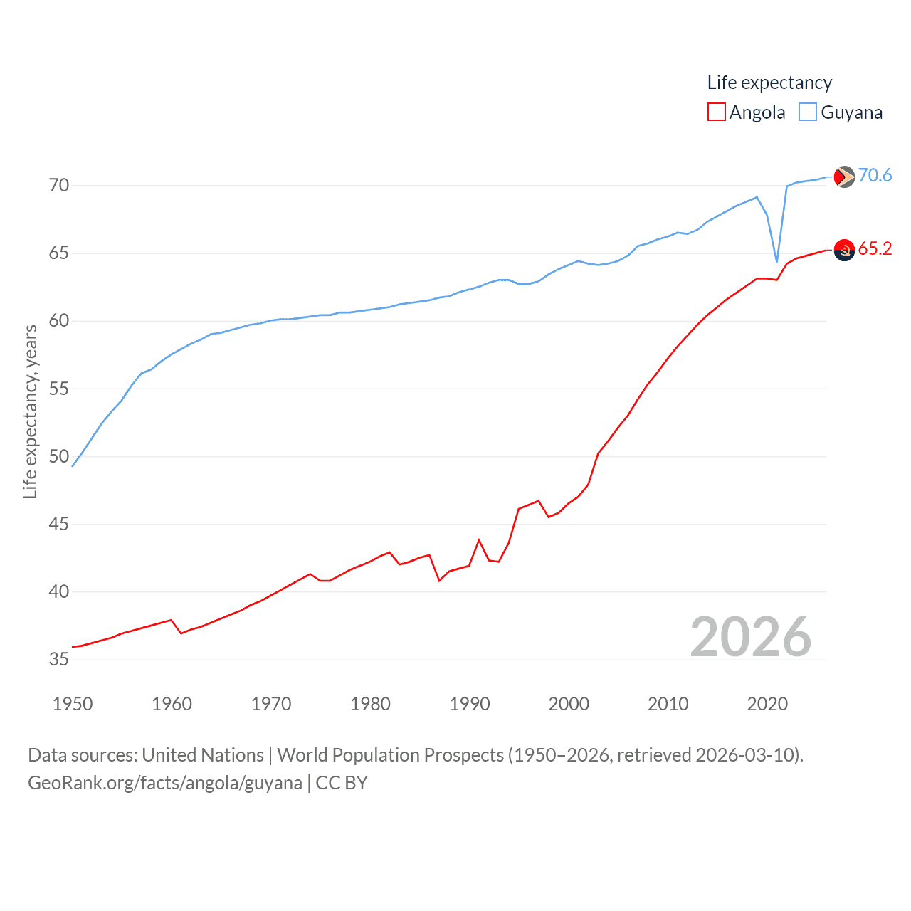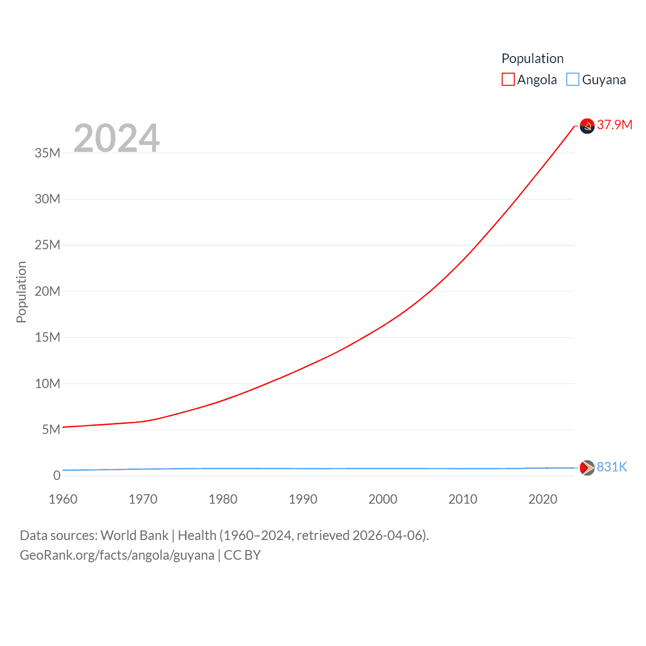 Angola has a population of 37.9M (ranked 40/197), compared with 831K in Guyana (ranked 161/197). Angola's land area is 481,354 sq mi versus 81,522 sq mi for Guyana (ranked 22nd vs. 82nd).