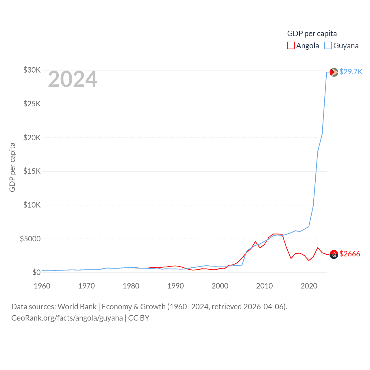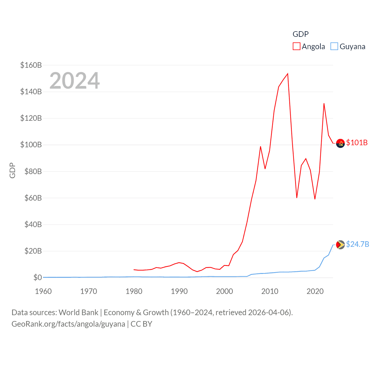 By GDP, Angola ranks 71/197 ($101B) and Guyana ranks 120/197 ($24.7B). By GDP per capita, Angola ranks 144/197 ($2,666), while Guyana ranks 41/197 ($29,675).