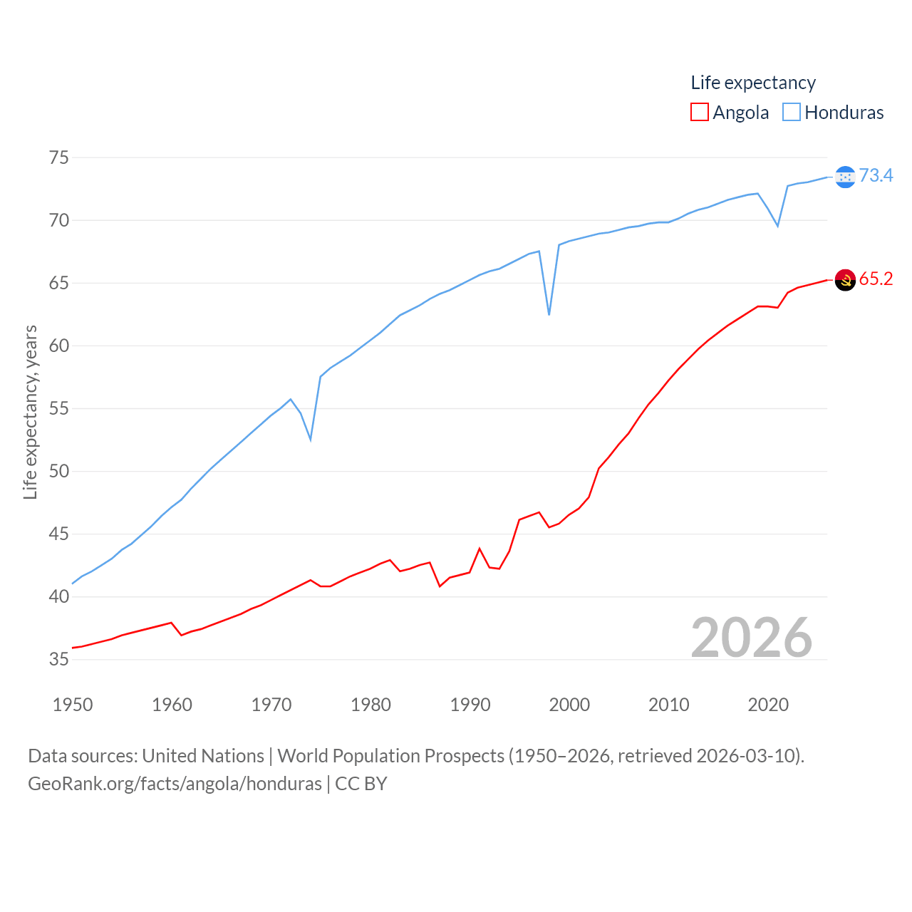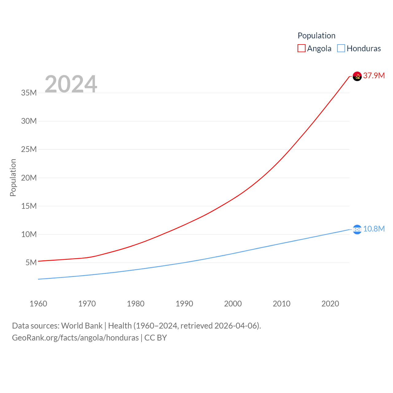 Angola has a population of 37.9M (ranked 40/197), compared with 10.8M in Honduras (ranked 89/197). Angola's land area is 481,354 sq mi versus 43,201 sq mi for Honduras (ranked 22nd vs. 100th).