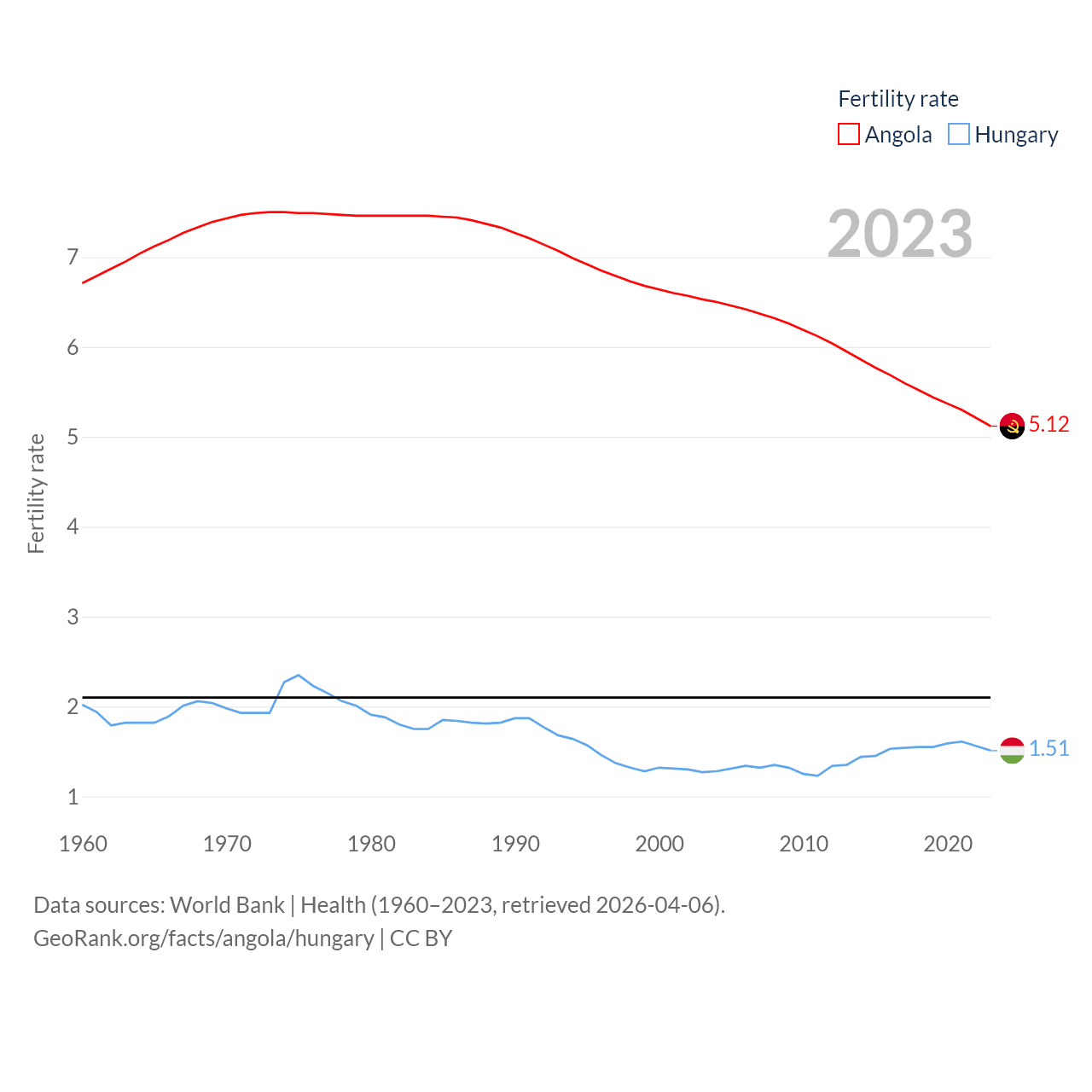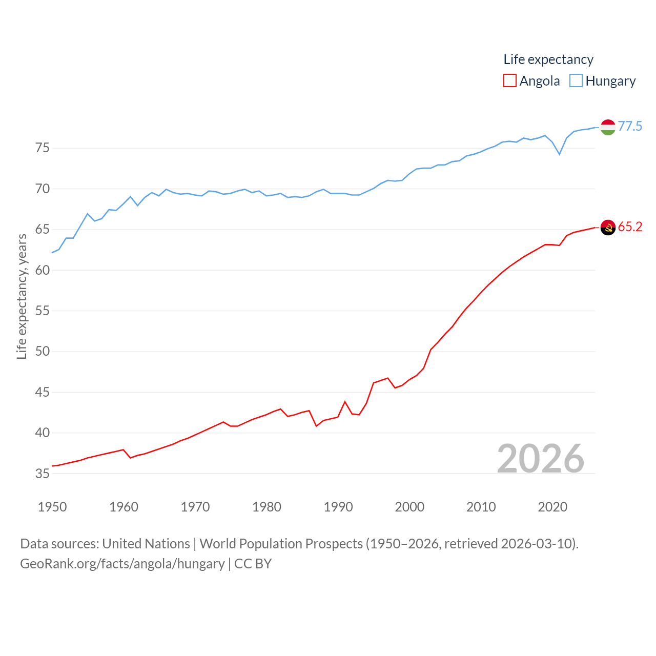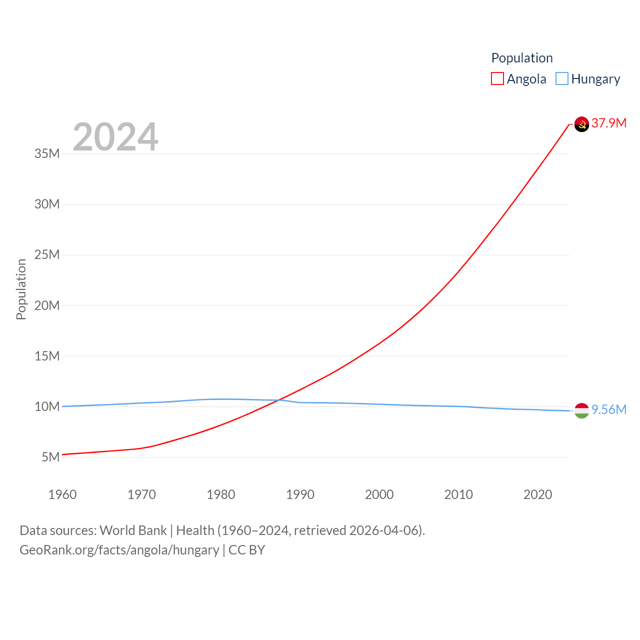 Angola has a population of 37.9M (ranked 40/197), compared with 9.56M in Hungary (ranked 97/197). Angola's land area is 481,354 sq mi versus 35,236 sq mi for Hungary (ranked 22nd vs. 109th).