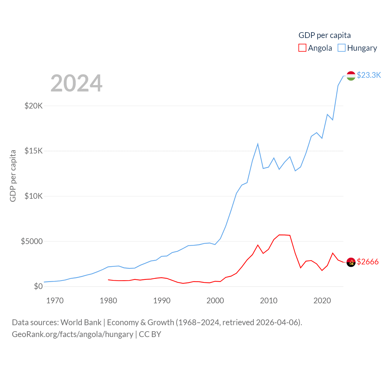 By GDP, Angola ranks 71/197 ($101B) and Hungary ranks 55/197 ($223B). By GDP per capita, Angola ranks 144/197 ($2,666), while Hungary ranks 55/197 ($23,292).