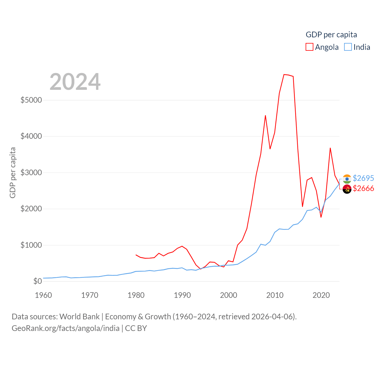 By GDP, Angola ranks 71/197 ($101B) and India ranks 5/197 ($3.91T). By GDP per capita, Angola ranks 144/197 ($2,666), while India ranks 143/197 ($2,695).