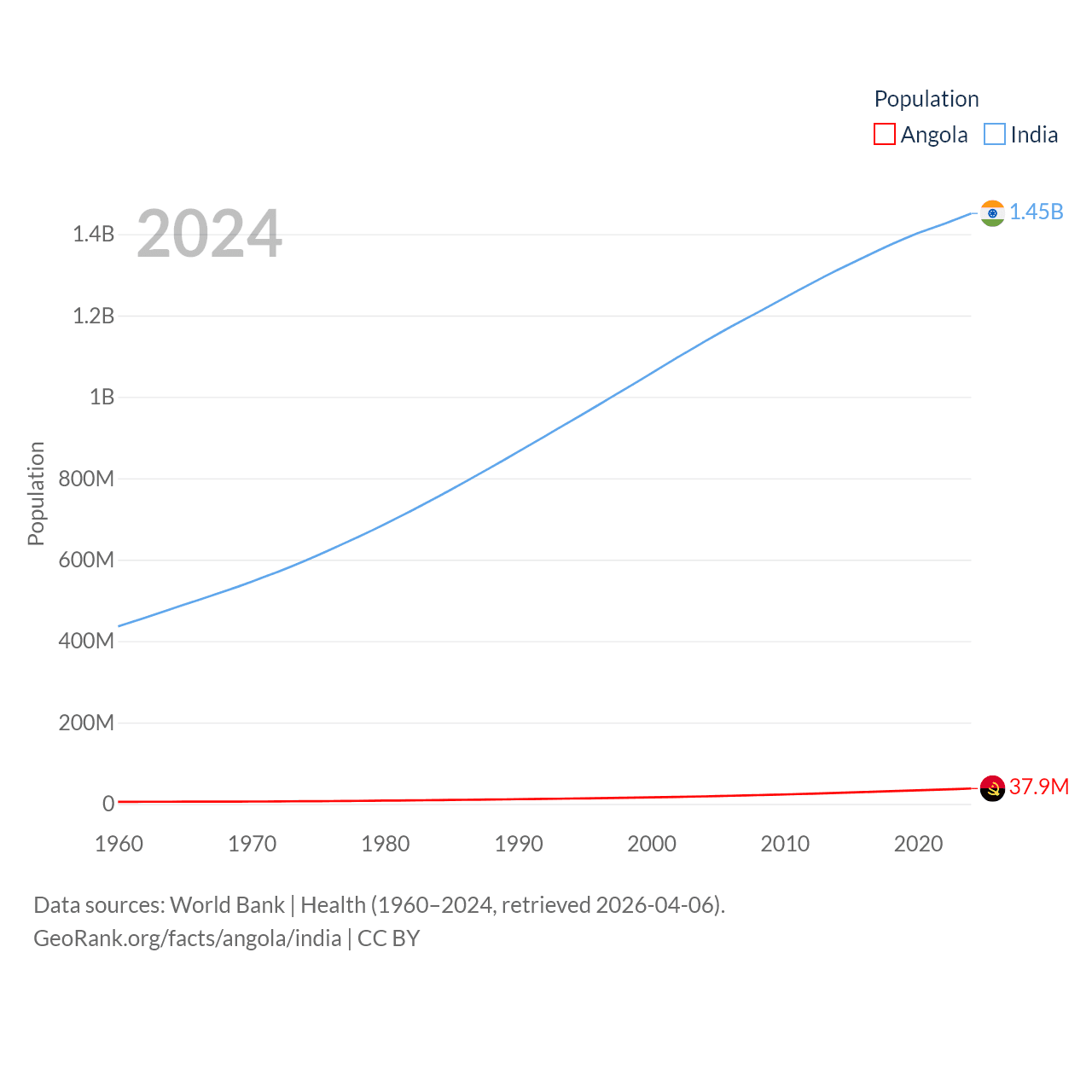 Angola has a population of 37.9M (ranked 40/197), compared with 1.45B in India (ranked 1/197). Angola's land area is 481,354 sq mi versus 1,147,955 sq mi for India (ranked 22nd vs. 7th).