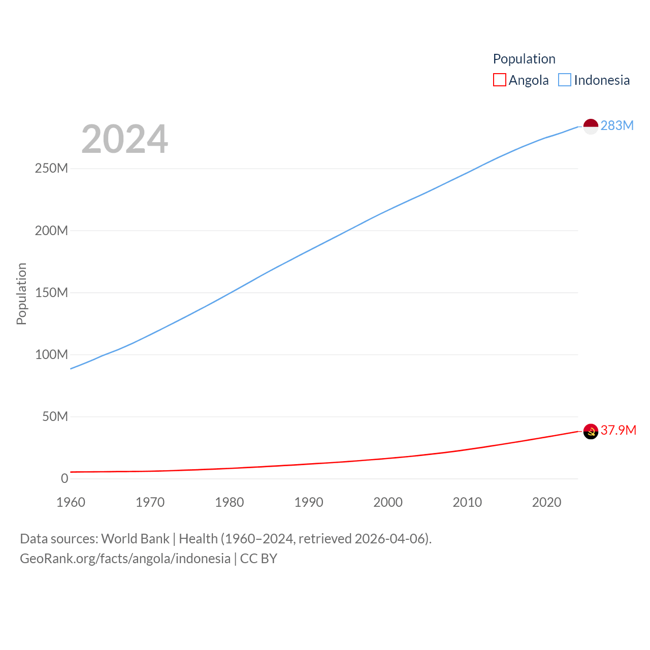 Angola has a population of 37.9M (ranked 40/197), compared with 283M in Indonesia (ranked 4/197). Angola's land area is 481,354 sq mi versus 730,720 sq mi for Indonesia (ranked 22nd vs. 14th).