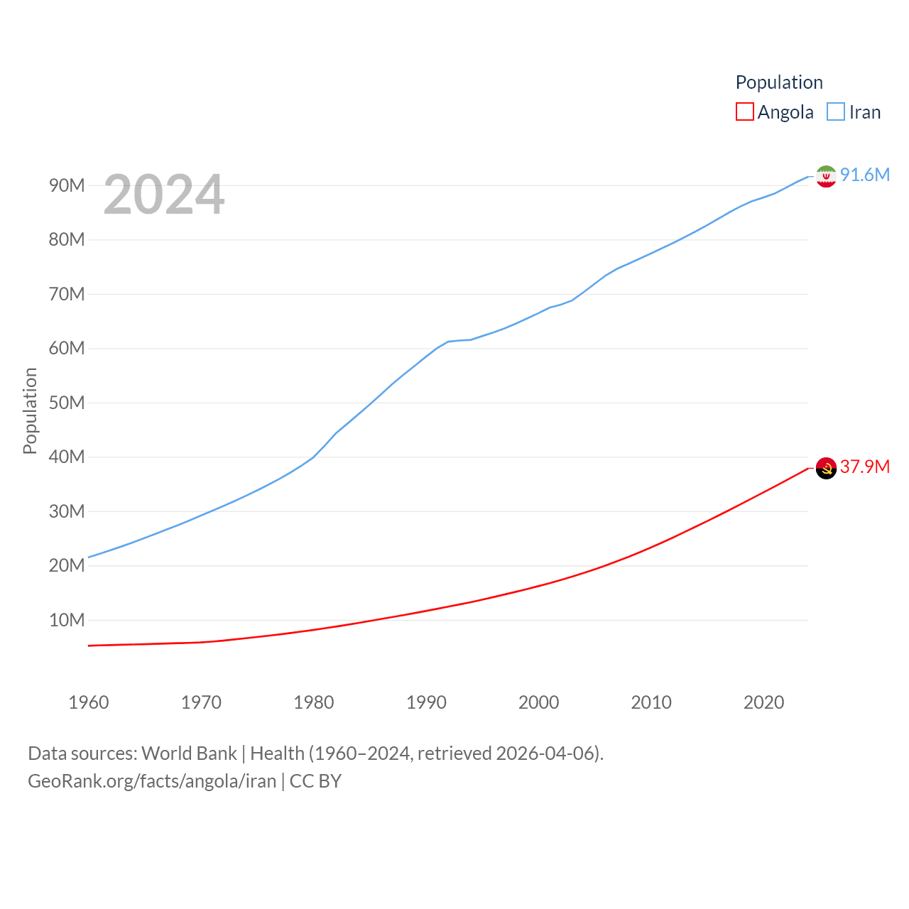 Angola has a population of 37.9M (ranked 40/197), compared with 91.6M in Iran (ranked 17/197). Angola's land area is 481,354 sq mi versus 626,451 sq mi for Iran (ranked 22nd vs. 17th).