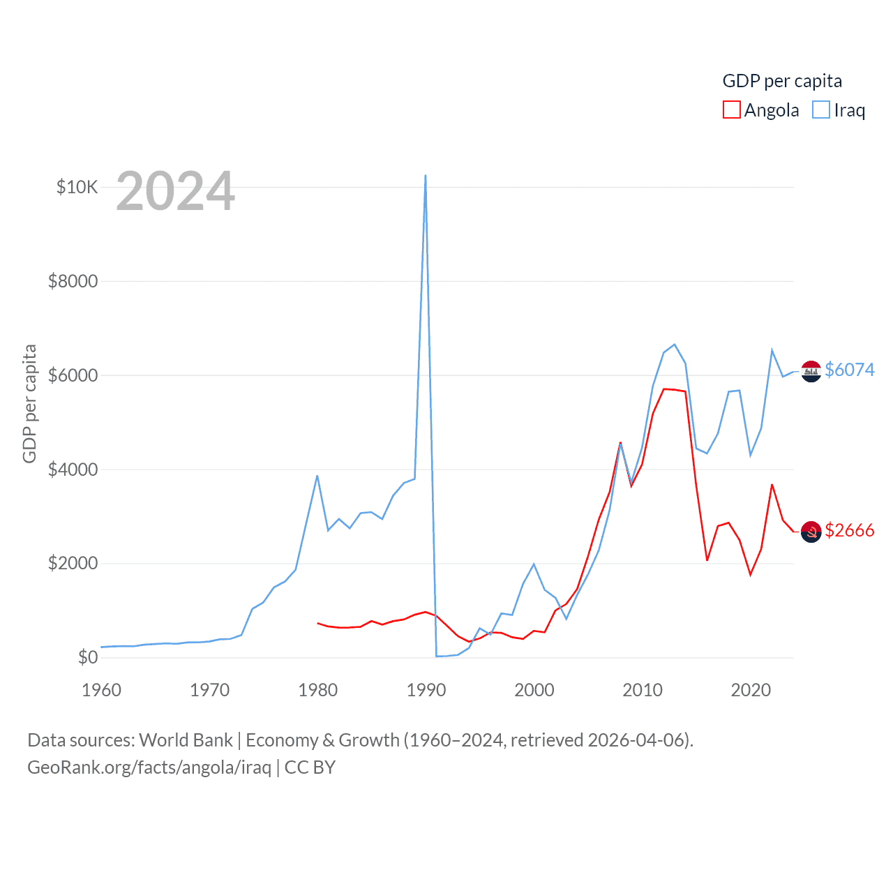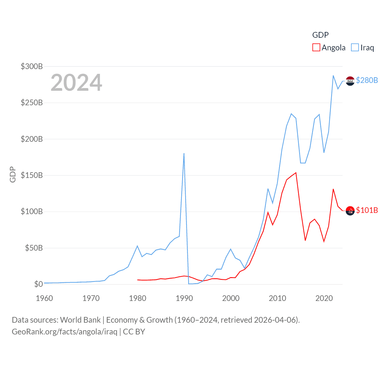 By GDP, Angola ranks 71/197 ($101B) and Iraq ranks 50/197 ($280B). By GDP per capita, Angola ranks 144/197 ($2,666), while Iraq ranks 113/197 ($6,074).