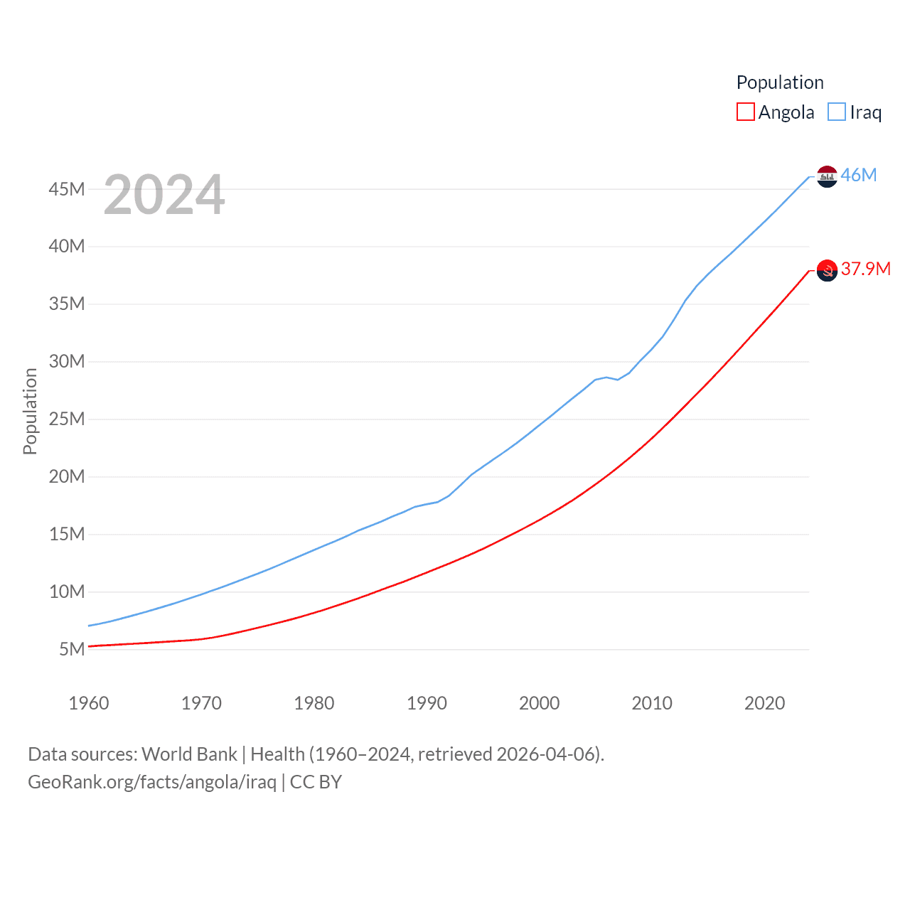 Angola has a population of 37.9M (ranked 40/197), compared with 46M in Iraq (ranked 34/197). Angola's land area is 481,354 sq mi versus 167,619 sq mi for Iraq (ranked 22nd vs. 57th).