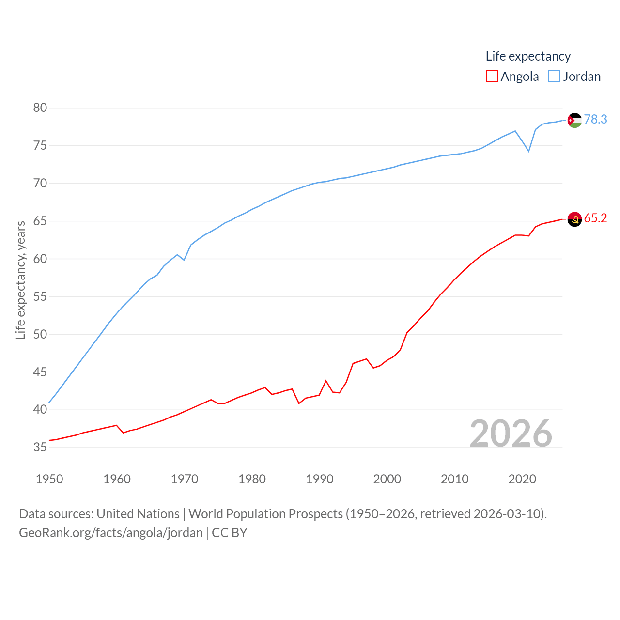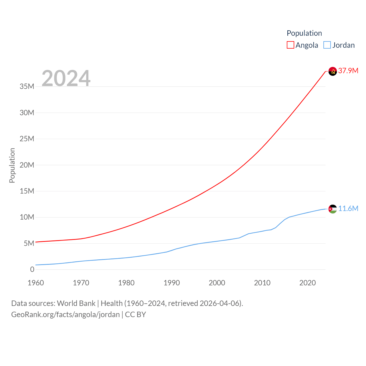 Angola has a population of 37.9M (ranked 40/197), compared with 11.6M in Jordan (ranked 84/197). Angola's land area is 481,354 sq mi versus 34,284 sq mi for Jordan (ranked 22nd vs. 110th).
