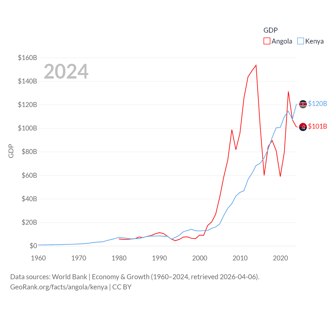 By GDP, Angola ranks 71/197 ($101B) and Kenya ranks 64/197 ($120B). By GDP per capita, Angola ranks 144/197 ($2,666), while Kenya ranks 154/197 ($2,132).