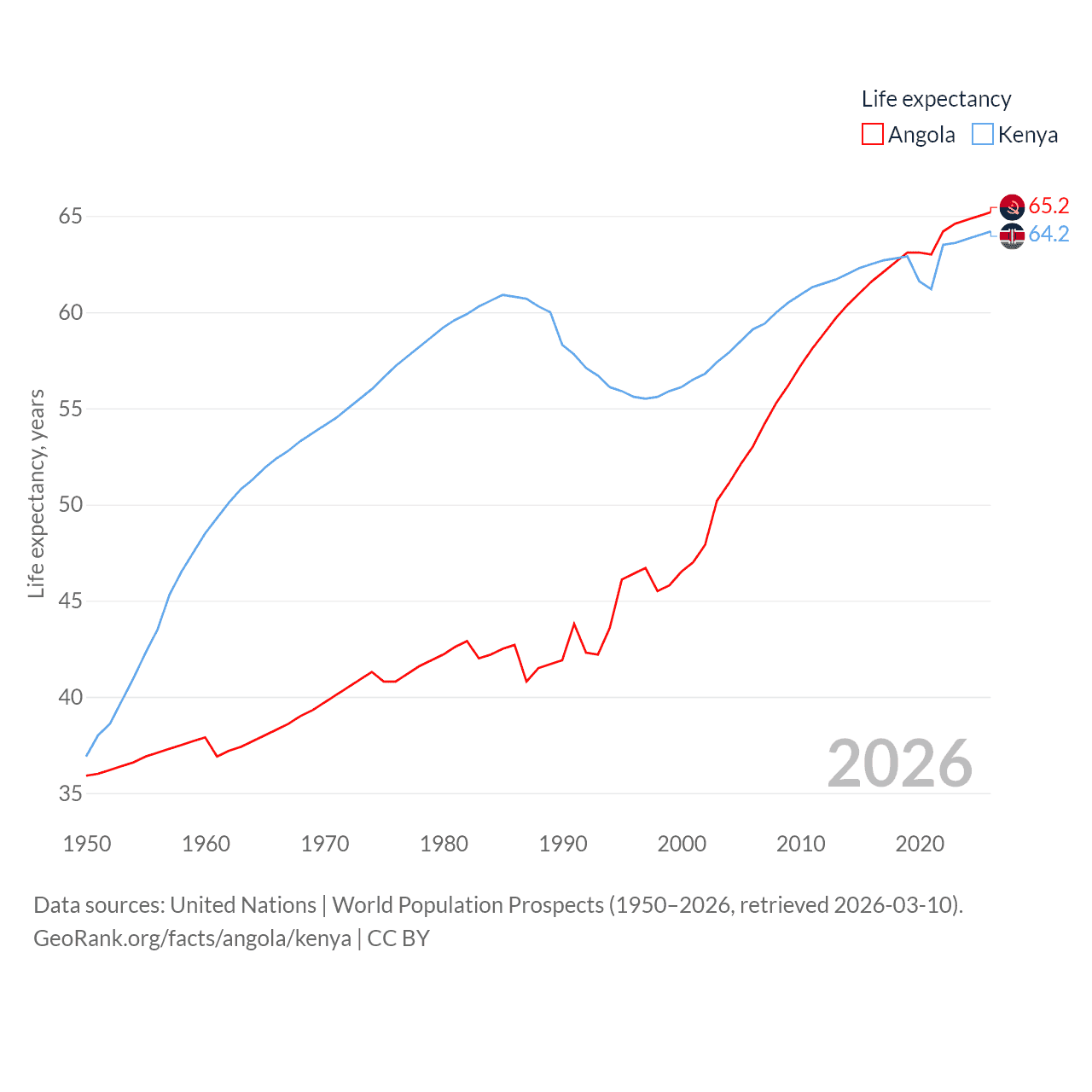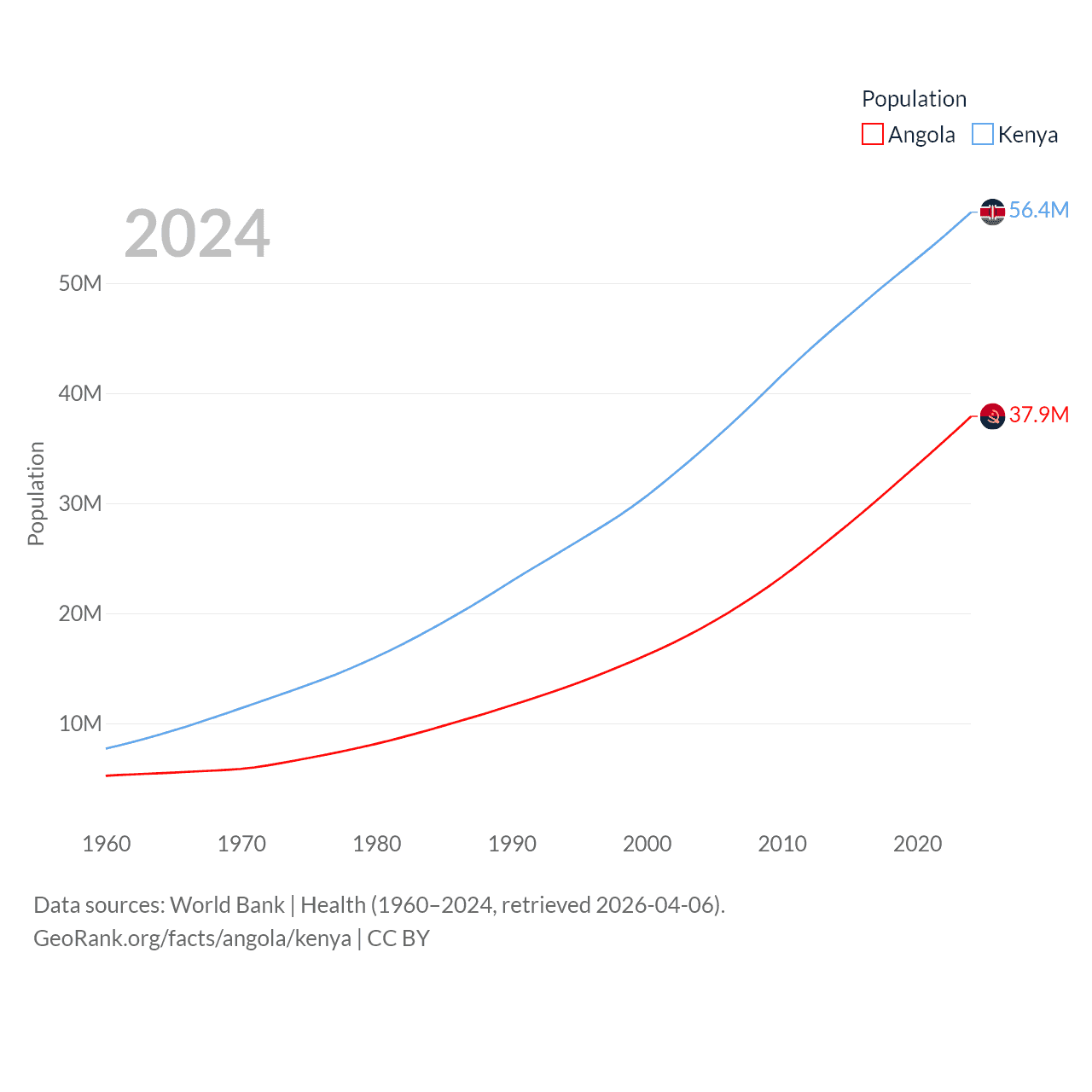 Angola has a population of 37.9M (ranked 40/197), compared with 56.4M in Kenya (ranked 26/197). Angola's land area is 481,354 sq mi versus 224,278 sq mi for Kenya (ranked 22nd vs. 45th).
