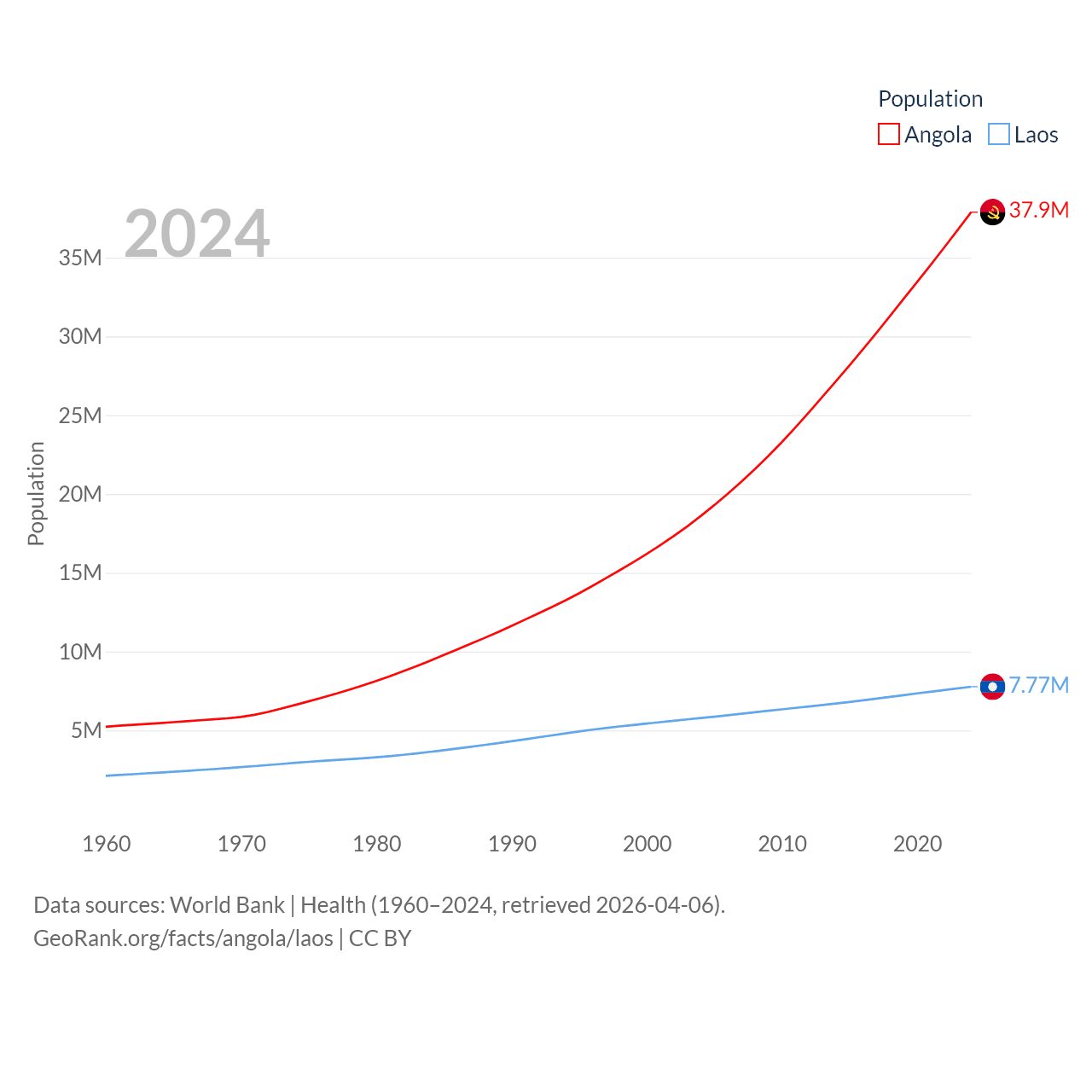 Angola has a population of 37.9M (ranked 40/197), compared with 7.77M in Laos (ranked 103/197). Angola's land area is 481,354 sq mi versus 89,112 sq mi for Laos (ranked 22nd vs. 79th).