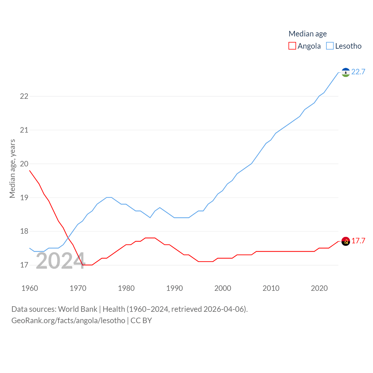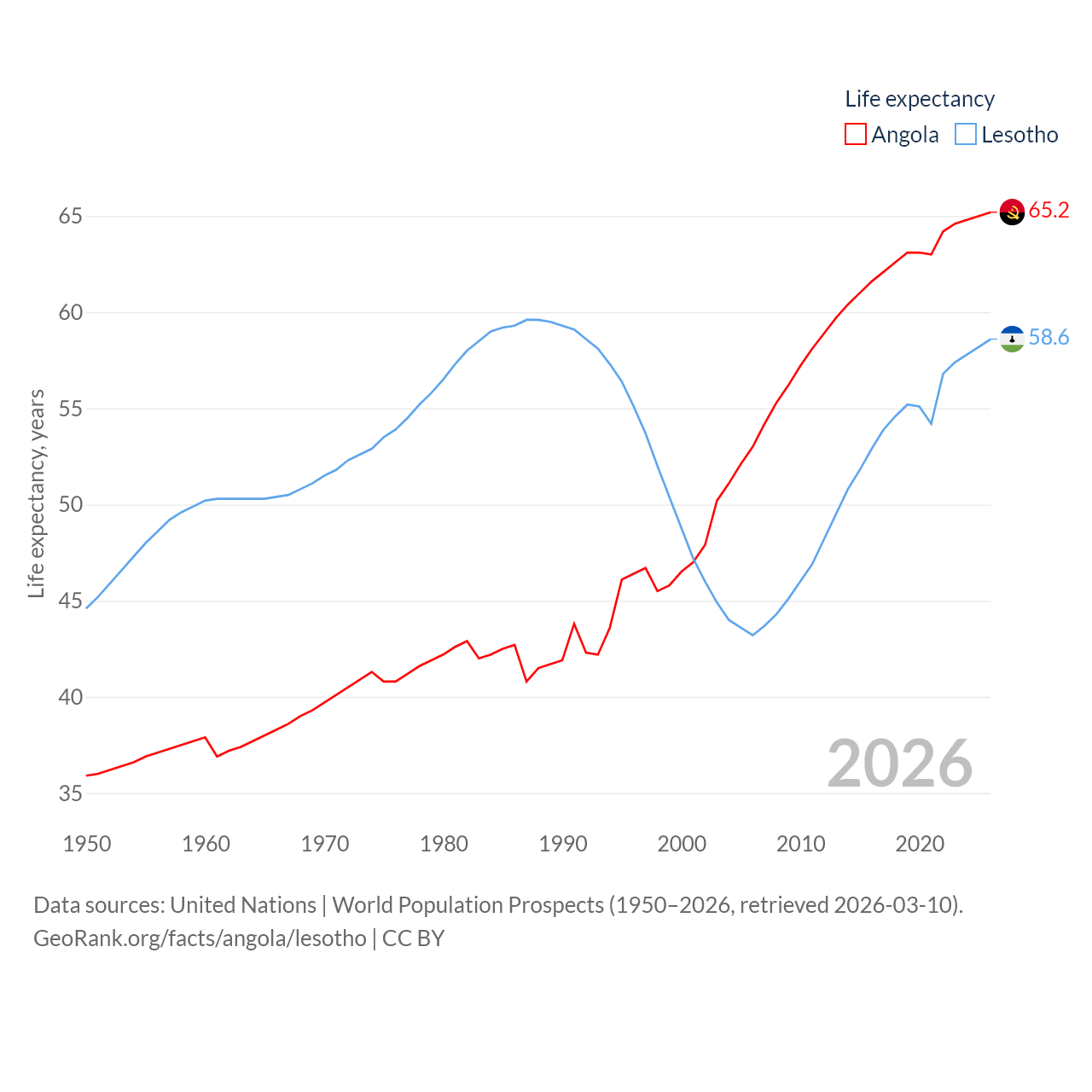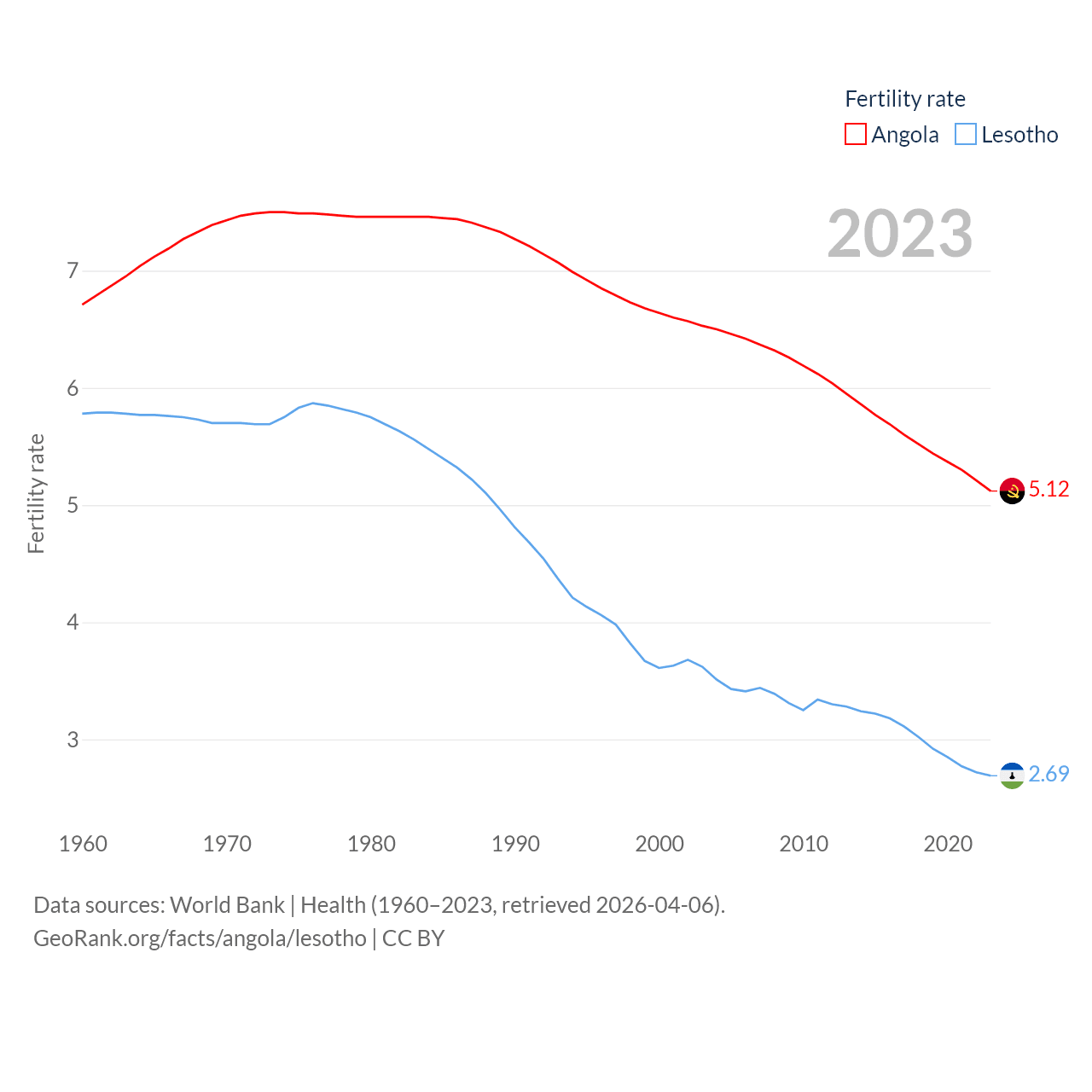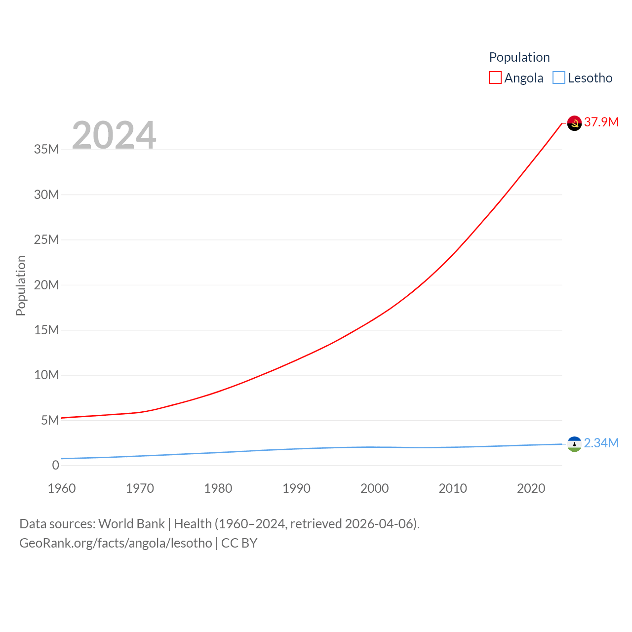 Angola has a population of 37.9M (ranked 40/197), compared with 2.34M in Lesotho (ranked 145/197). Angola's land area is 481,354 sq mi versus 11,722 sq mi for Lesotho (ranked 22nd vs. 137th).