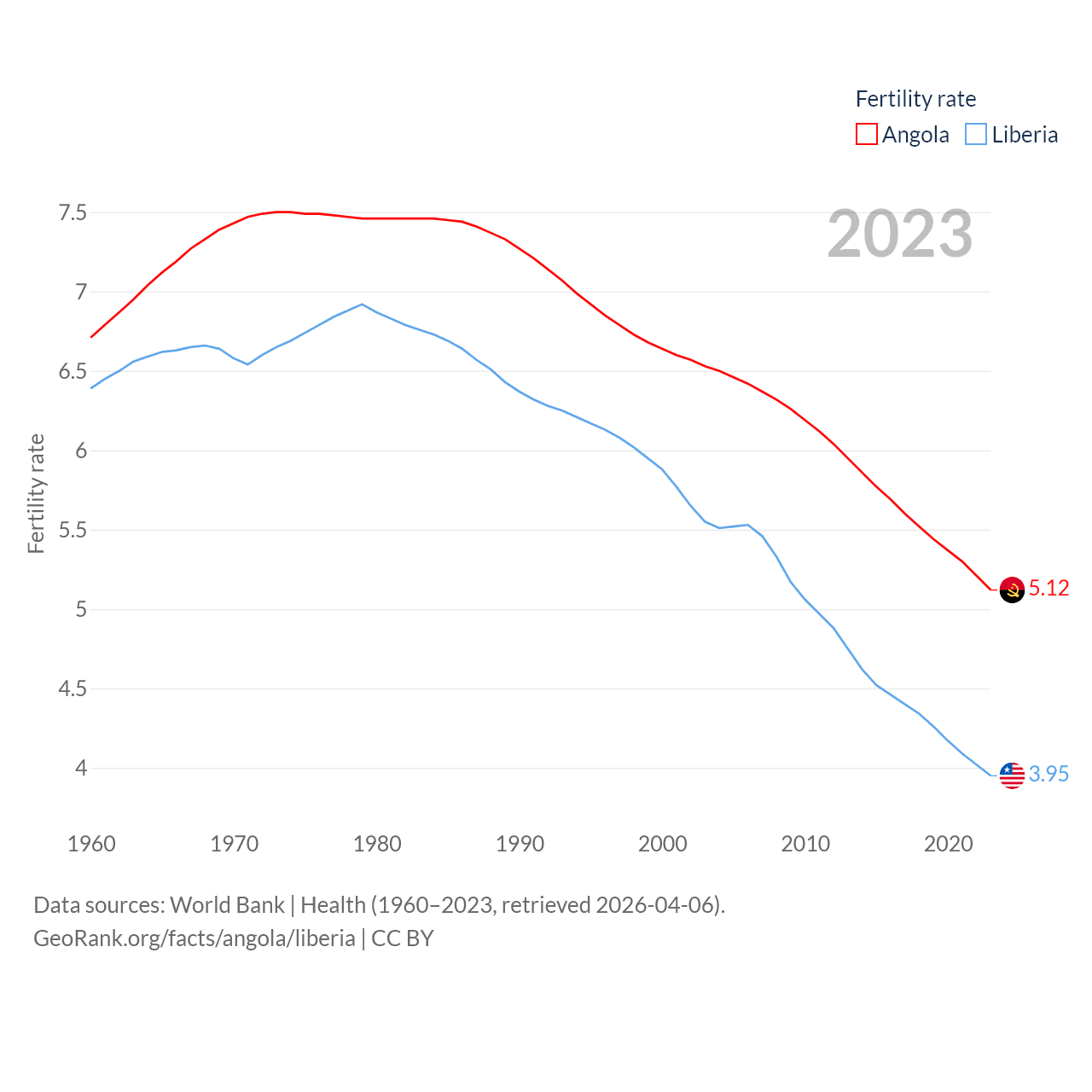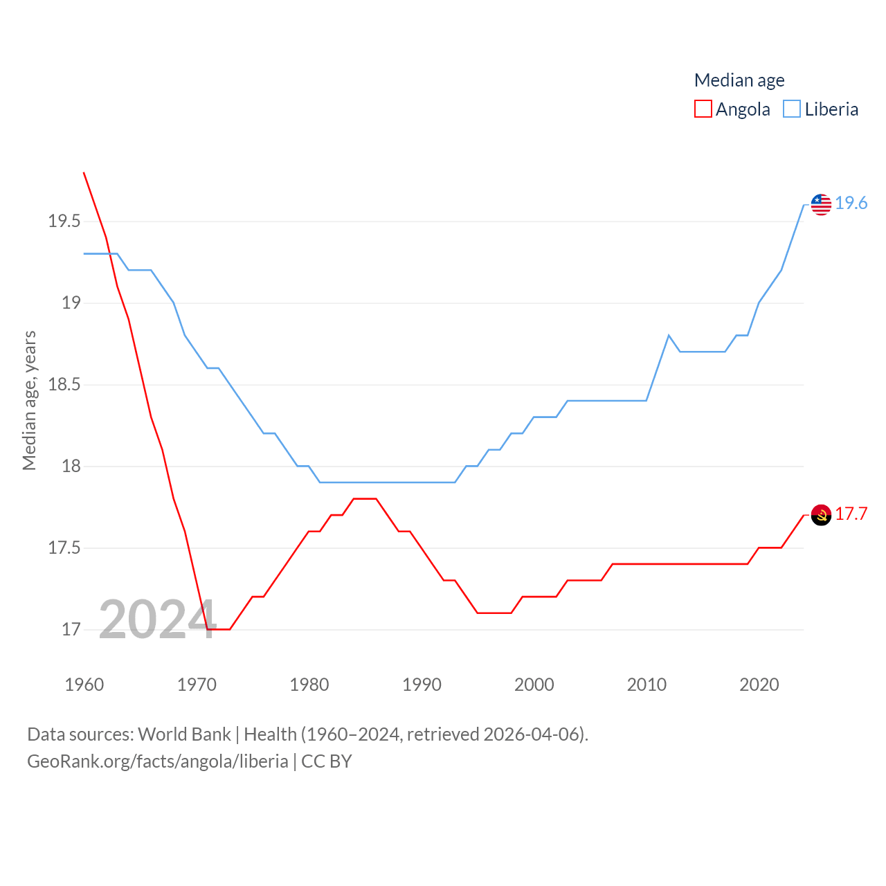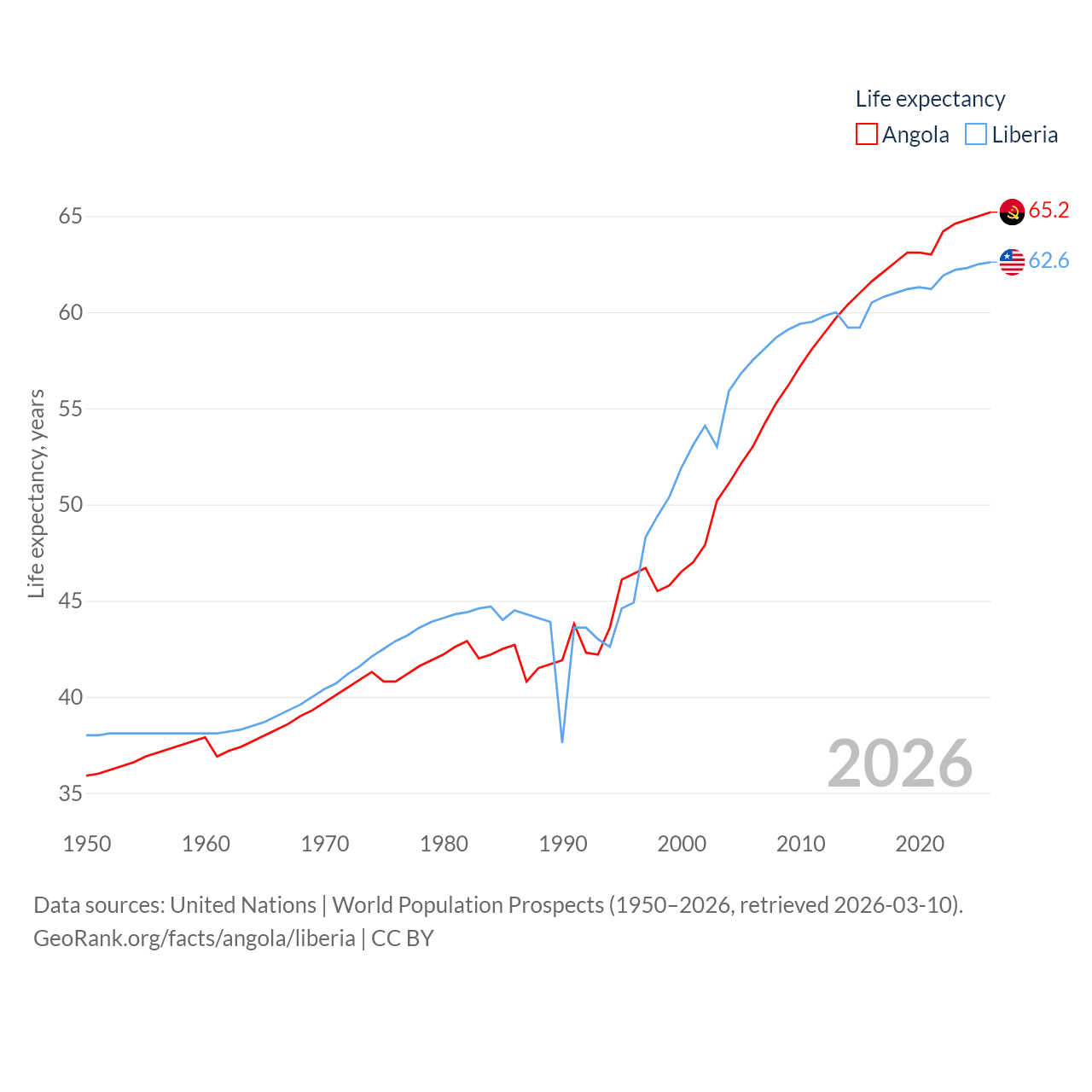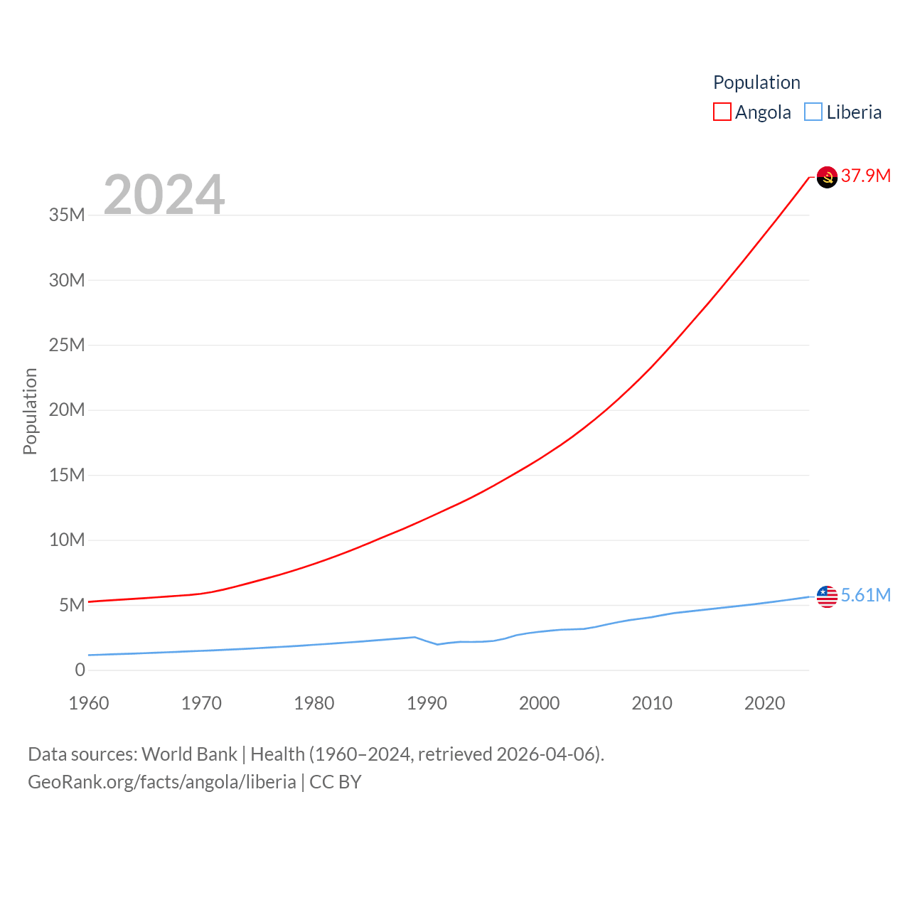 Angola has a population of 37.9M (ranked 40/197), compared with 5.61M in Liberia (ranked 117/197). Angola's land area is 481,354 sq mi versus 37,189 sq mi for Liberia (ranked 22nd vs. 106th).