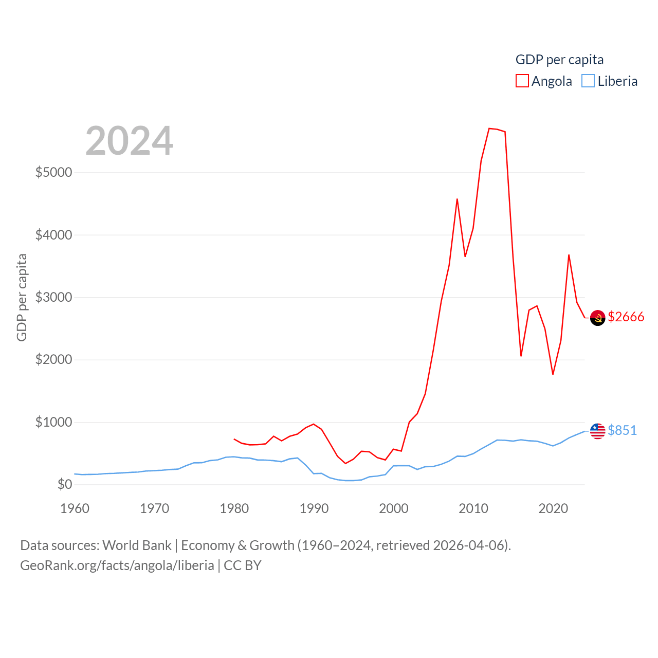 By GDP, Angola ranks 71/197 ($101B) and Liberia ranks 163/197 ($4.78B). By GDP per capita, Angola ranks 144/197 ($2,666), while Liberia ranks 184/197 ($851).