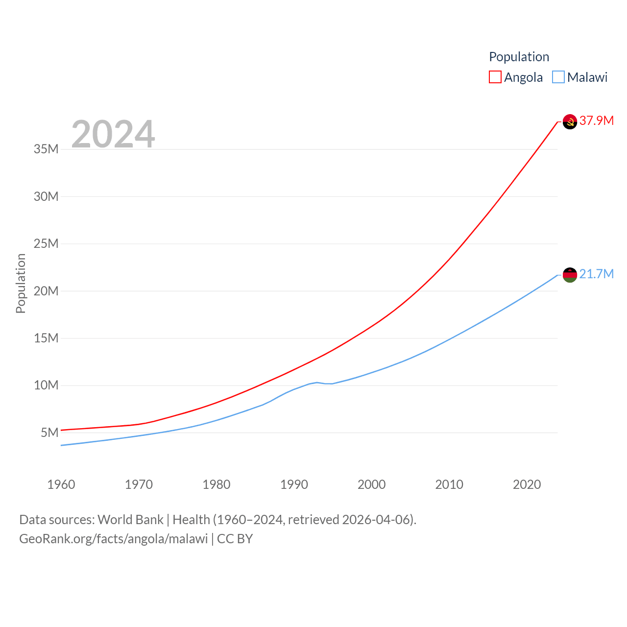Angola has a population of 37.9M (ranked 40/197), compared with 21.7M in Malawi (ranked 62/197). Angola's land area is 481,354 sq mi versus 36,402 sq mi for Malawi (ranked 22nd vs. 107th).