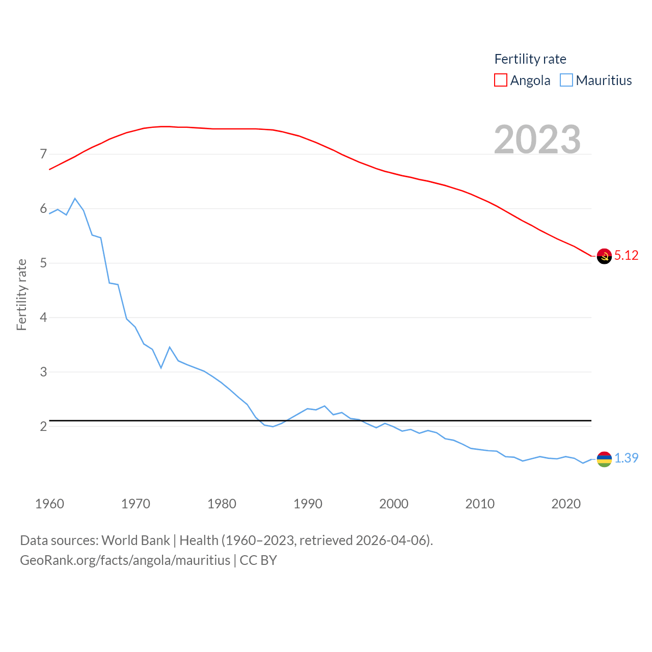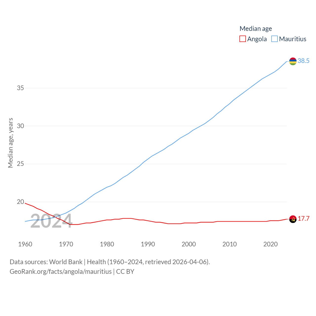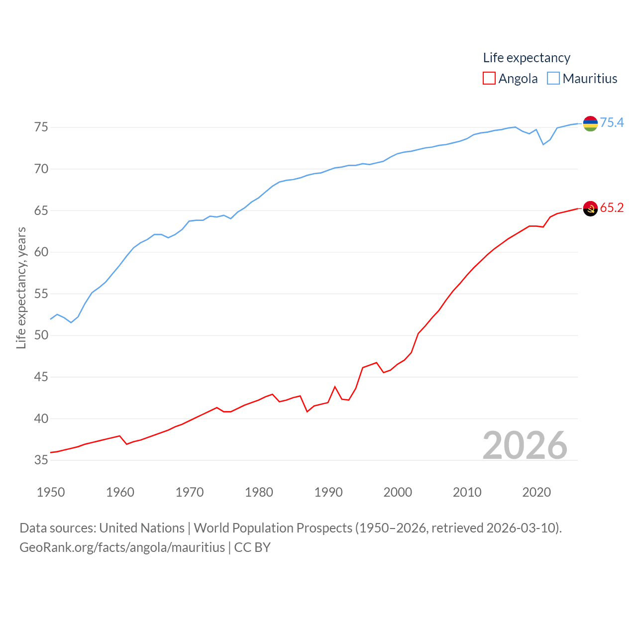 Angola has a population of 37.9M (ranked 40/197), compared with 1.25M in Mauritius (ranked 156/197). Angola's land area is 481,354 sq mi versus 771 sq mi for Mauritius (ranked 22nd vs. 170th).