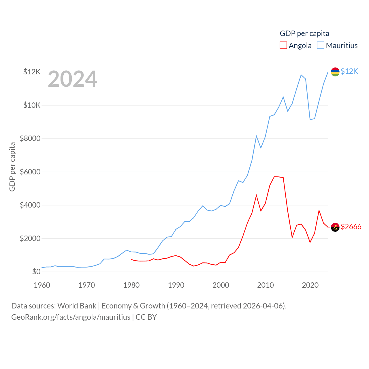By GDP, Angola ranks 71/197 ($101B) and Mauritius ranks 143/197 ($14.9B). By GDP per capita, Angola ranks 144/197 ($2,666), while Mauritius ranks 78/197 ($11,991).