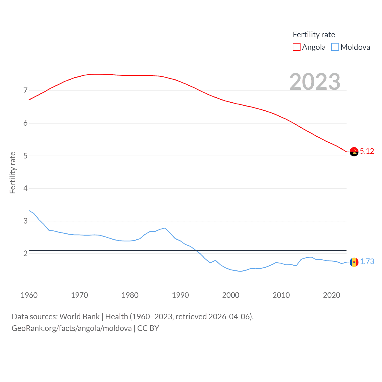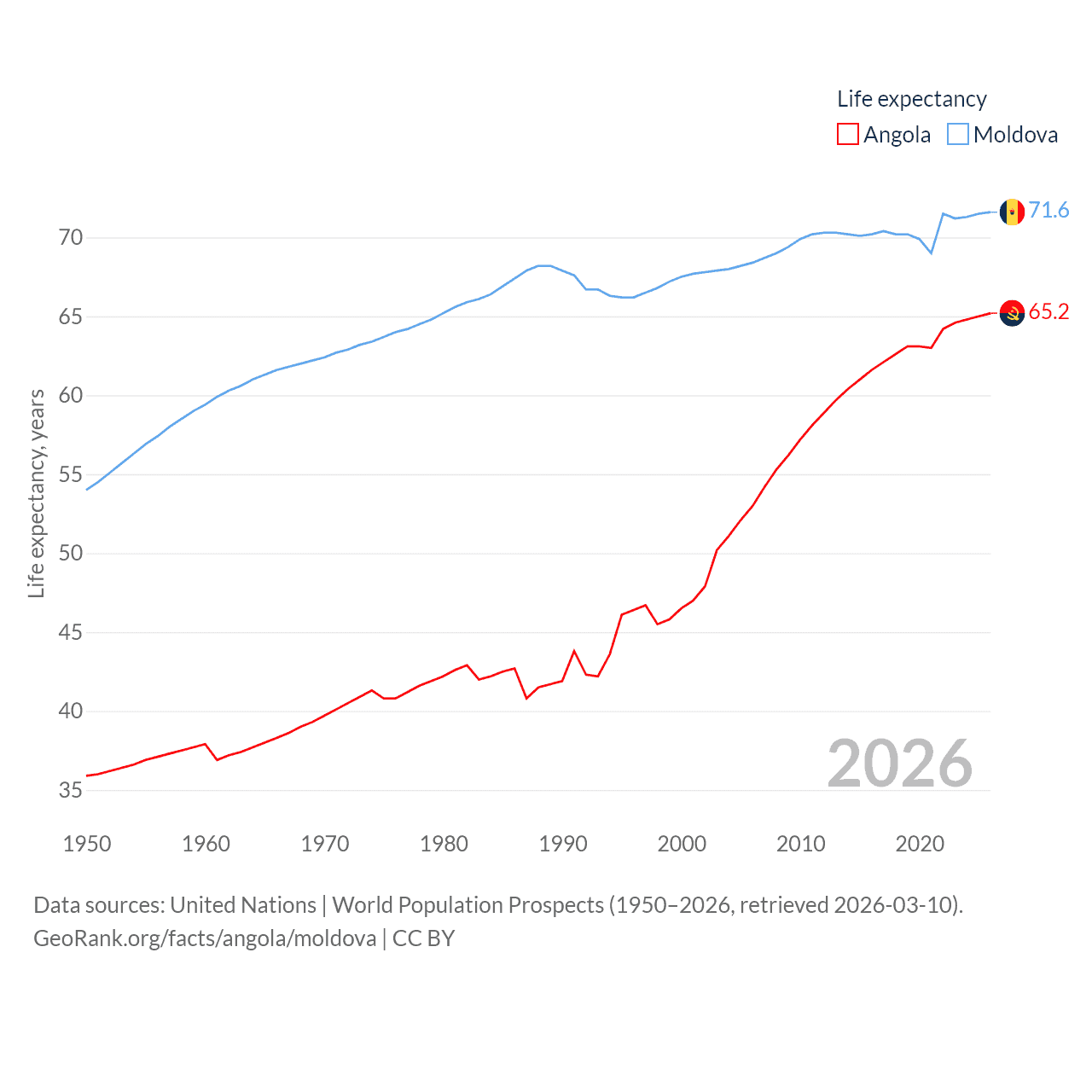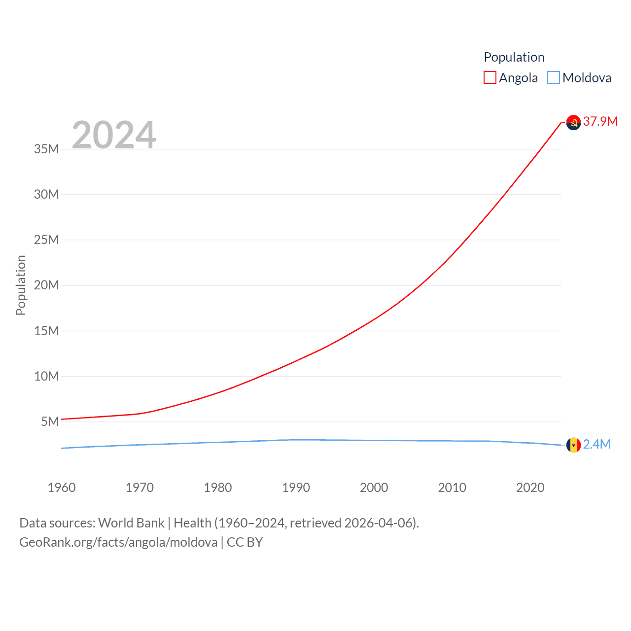 Angola has a population of 37.9M (ranked 40/197), compared with 2.4M in Moldova (ranked 143/197). Angola's land area is 481,354 sq mi versus 12,714 sq mi for Moldova (ranked 22nd vs. 135th).