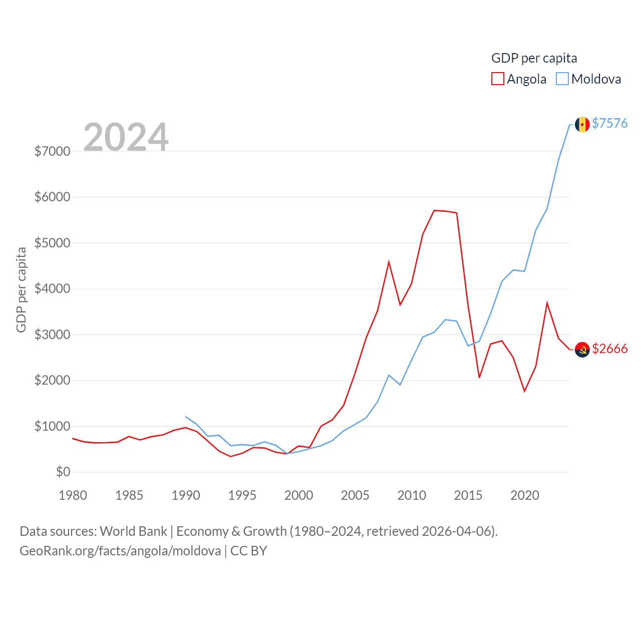 By GDP, Angola ranks 71/197 ($101B) and Moldova ranks 134/197 ($18.2B). By GDP per capita, Angola ranks 144/197 ($2,666), while Moldova ranks 99/197 ($7,576).
