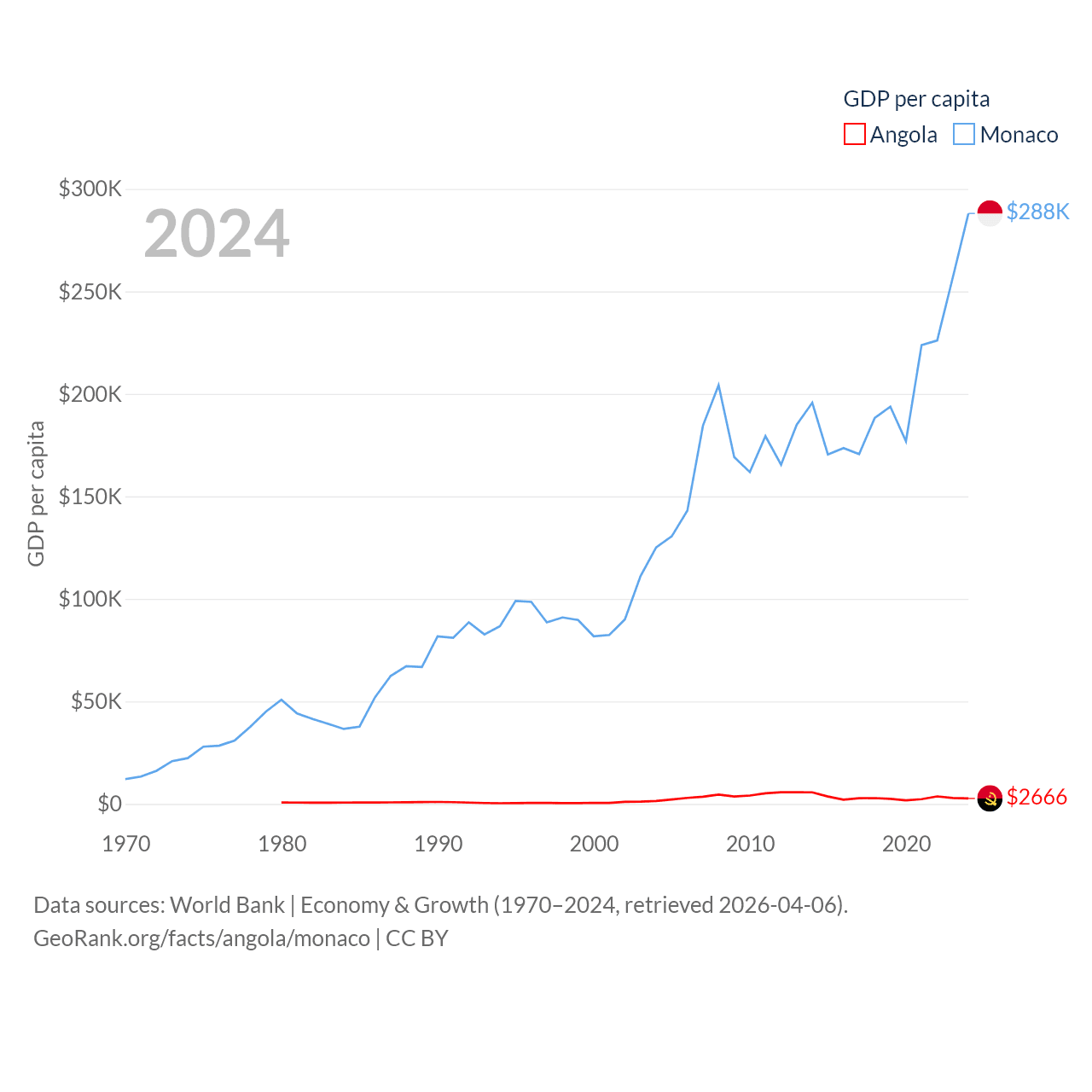 By GDP, Angola ranks 71/197 ($101B) and Monaco ranks 152/197 ($11.1B). By GDP per capita, Angola ranks 144/197 ($2,666), while Monaco ranks 1/197 ($288,001).