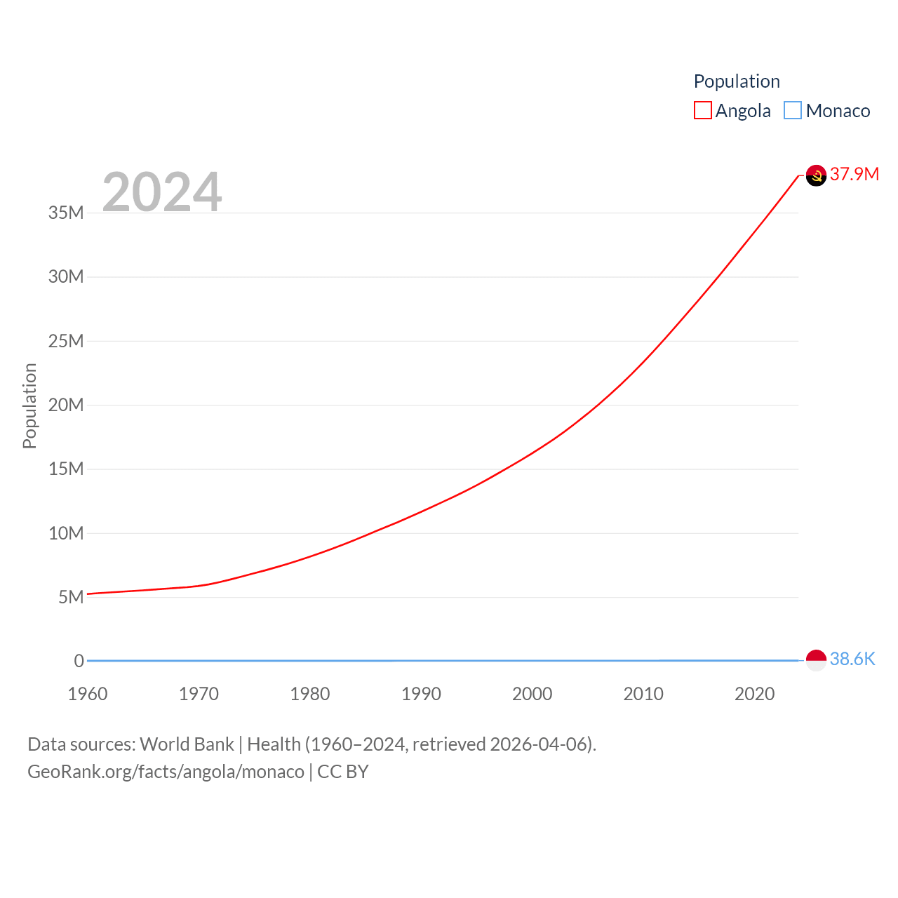 Angola has a population of 37.9M (ranked 40/197), compared with 38.6K in Monaco (ranked 191/197). Angola's land area is 481,354 sq mi versus 0.8 sq mi for Monaco (ranked 22nd vs. 196th).