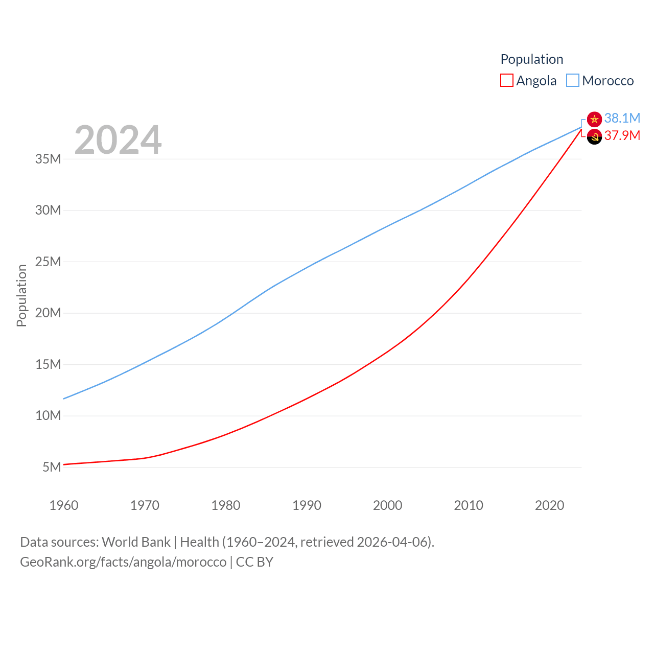 Angola has a population of 37.9M (ranked 40/197), compared with 38.1M in Morocco (ranked 39/197). Angola's land area is 481,354 sq mi versus 172,317 sq mi for Morocco (ranked 22nd vs. 55th).
