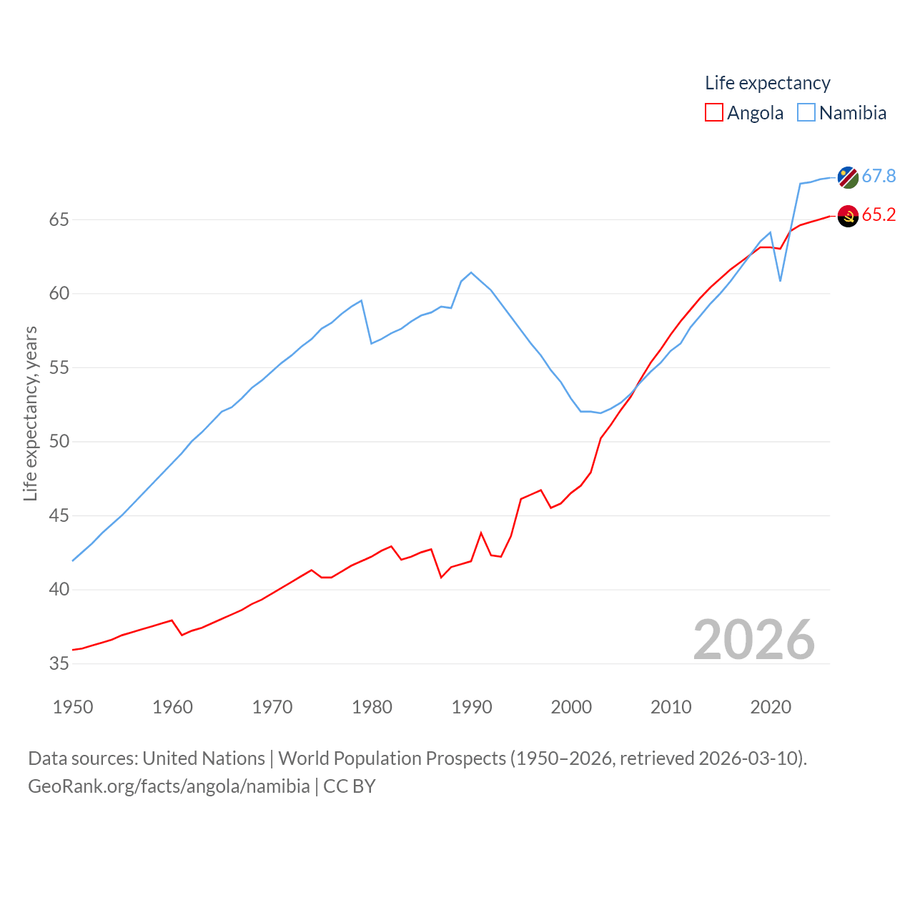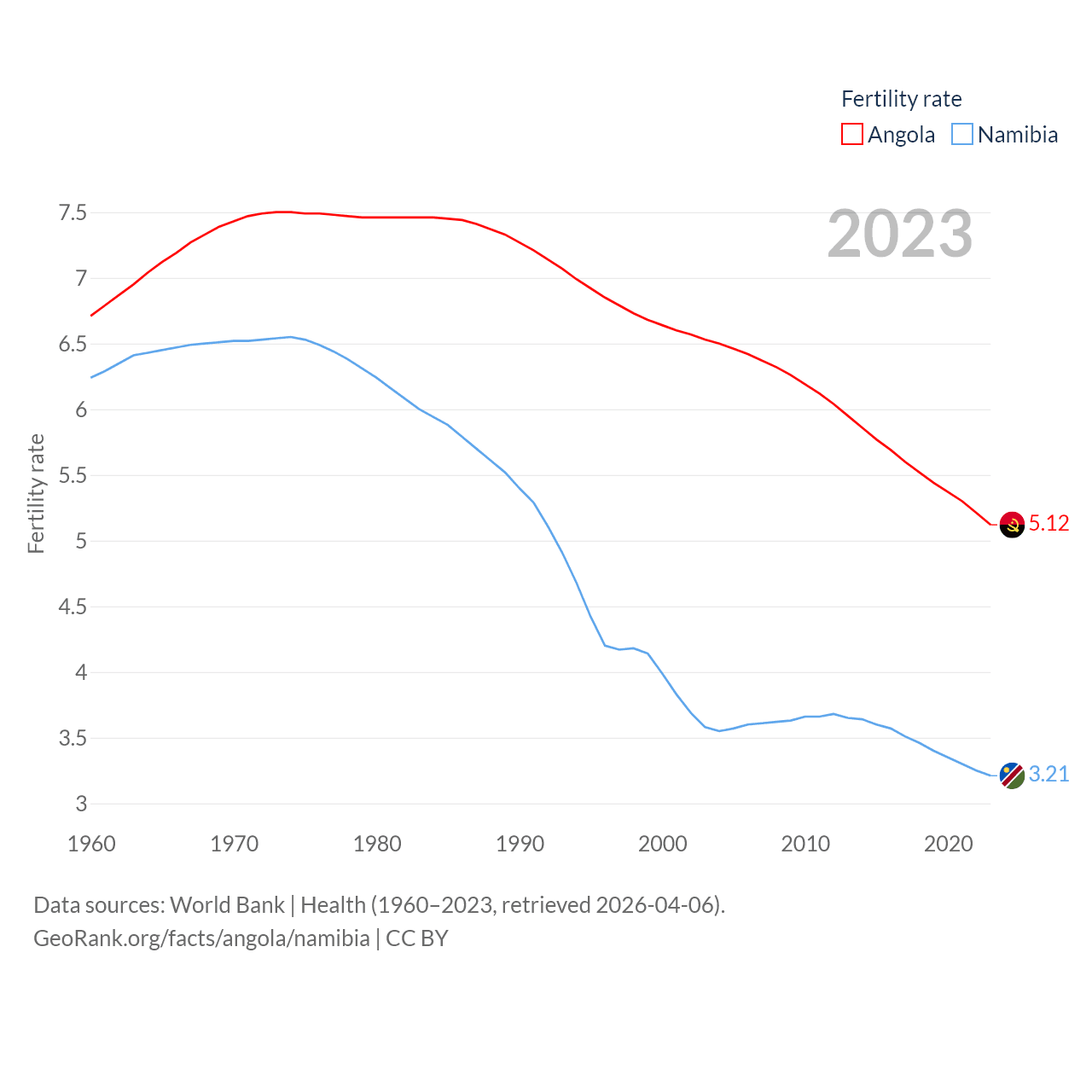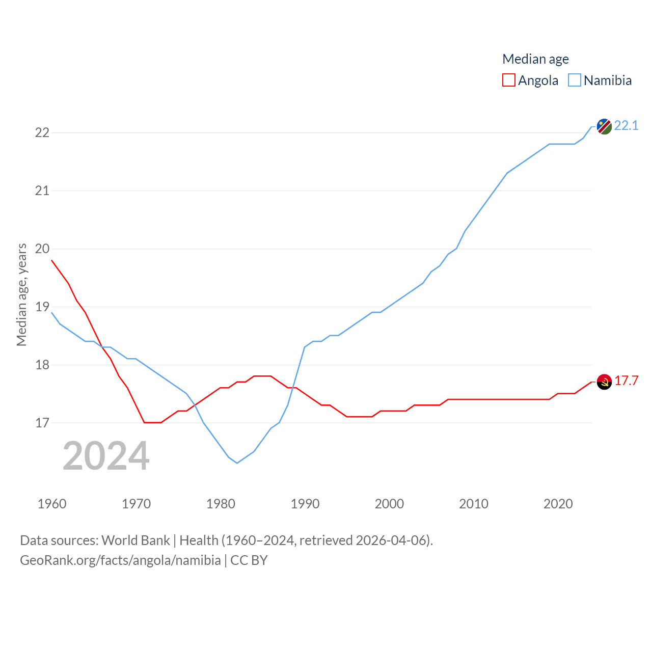 Angola has a population of 37.9M (ranked 40/197), compared with 3.03M in Namibia (ranked 136/197). Angola's land area is 481,354 sq mi versus 317,874 sq mi for Namibia (ranked 22nd vs. 33rd).