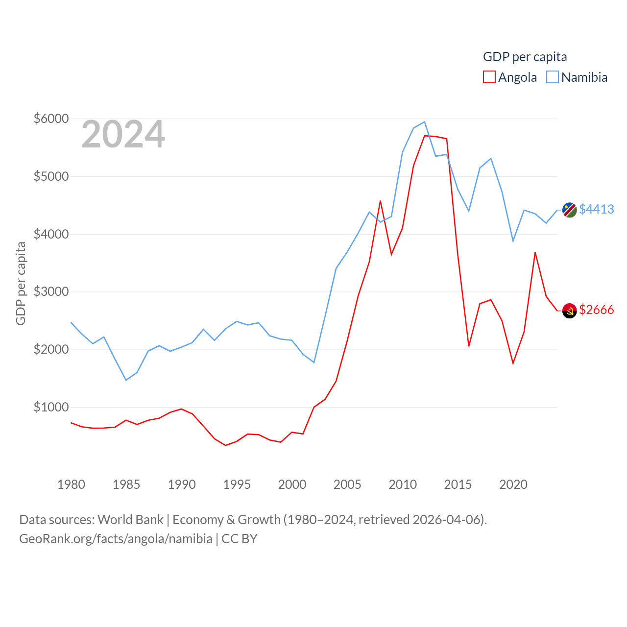 By GDP, Angola ranks 71/197 ($101B) and Namibia ranks 147/197 ($13.4B). By GDP per capita, Angola ranks 144/197 ($2,666), while Namibia ranks 126/197 ($4,413).