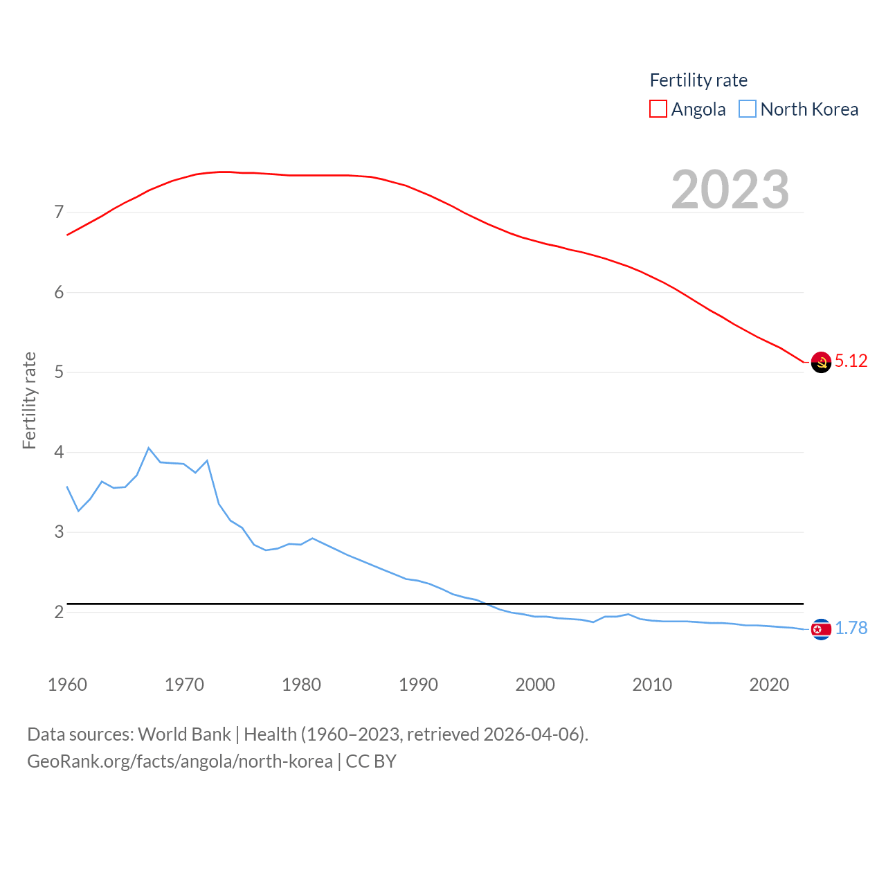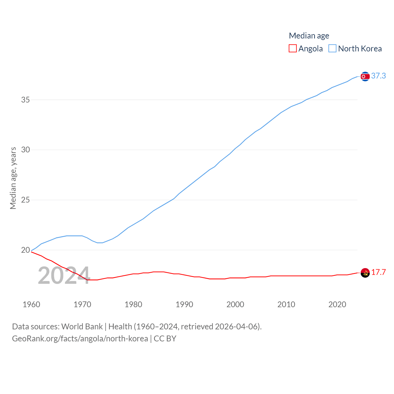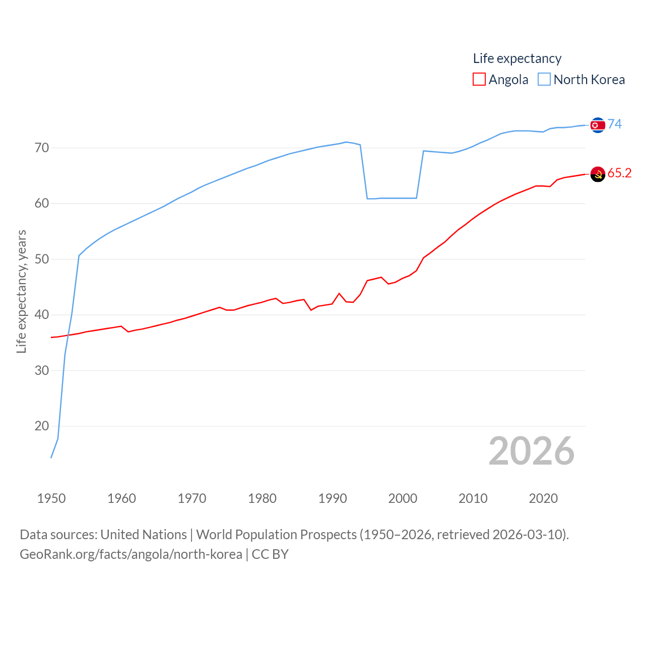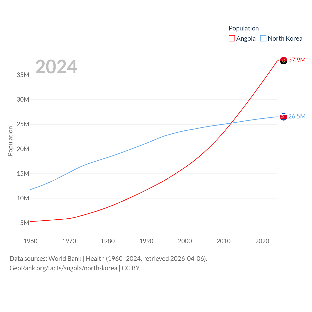 Angola has a population of 37.9M (ranked 40/197), compared with 26.5M in North Korea (ranked 56/197). Angola's land area is 481,354 sq mi versus 46,491 sq mi for North Korea (ranked 22nd vs. 97th).