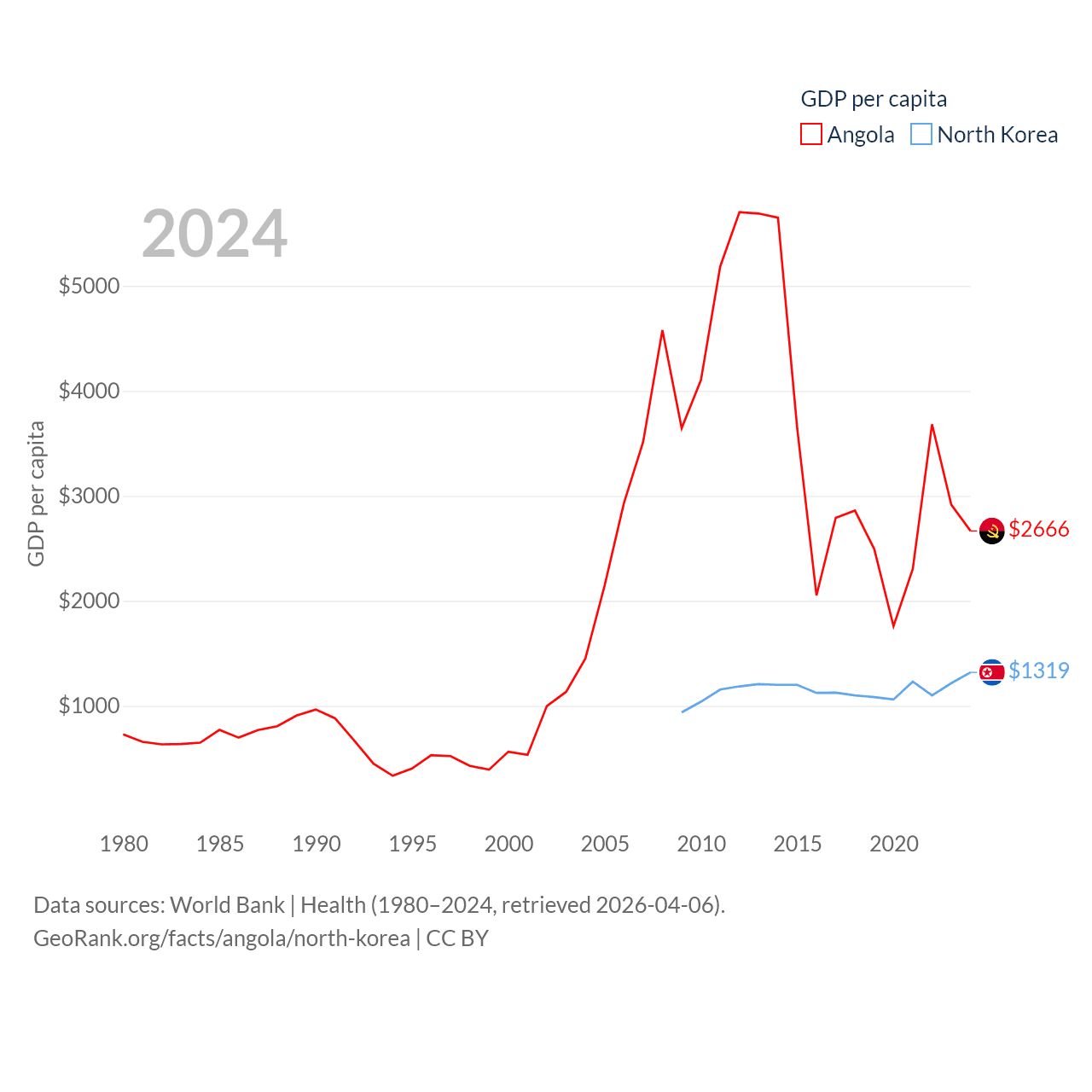 By GDP, Angola ranks 71/197 ($101B) and North Korea ranks 106/197 ($34.9B). By GDP per capita, Angola ranks 144/197 ($2,666), while North Korea ranks 168/197 ($1,319).