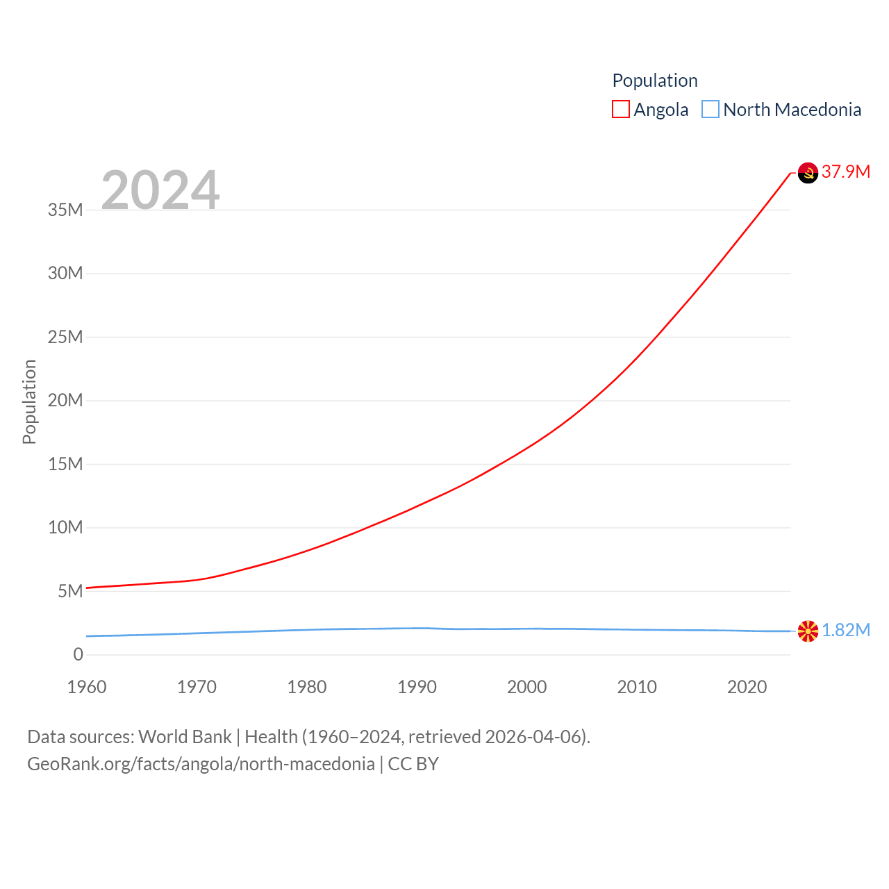 Angola has a population of 37.9M (ranked 40/197), compared with 1.82M in North Macedonia (ranked 150/197). Angola's land area is 481,354 sq mi versus 9,737 sq mi for North Macedonia (ranked 22nd vs. 145th).