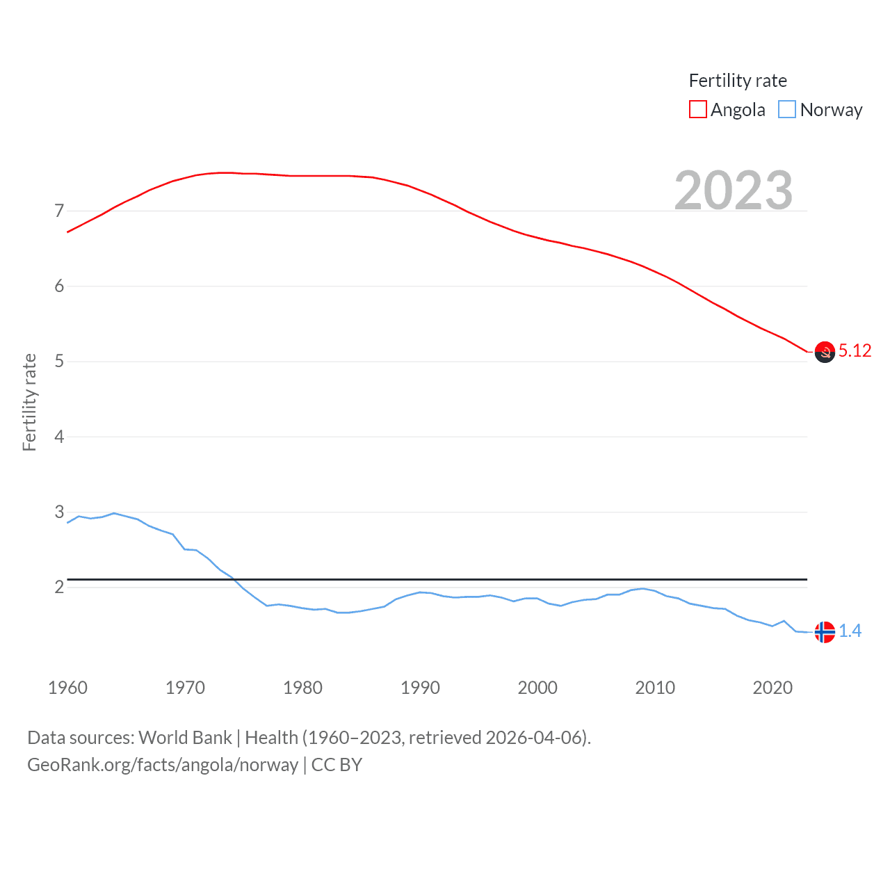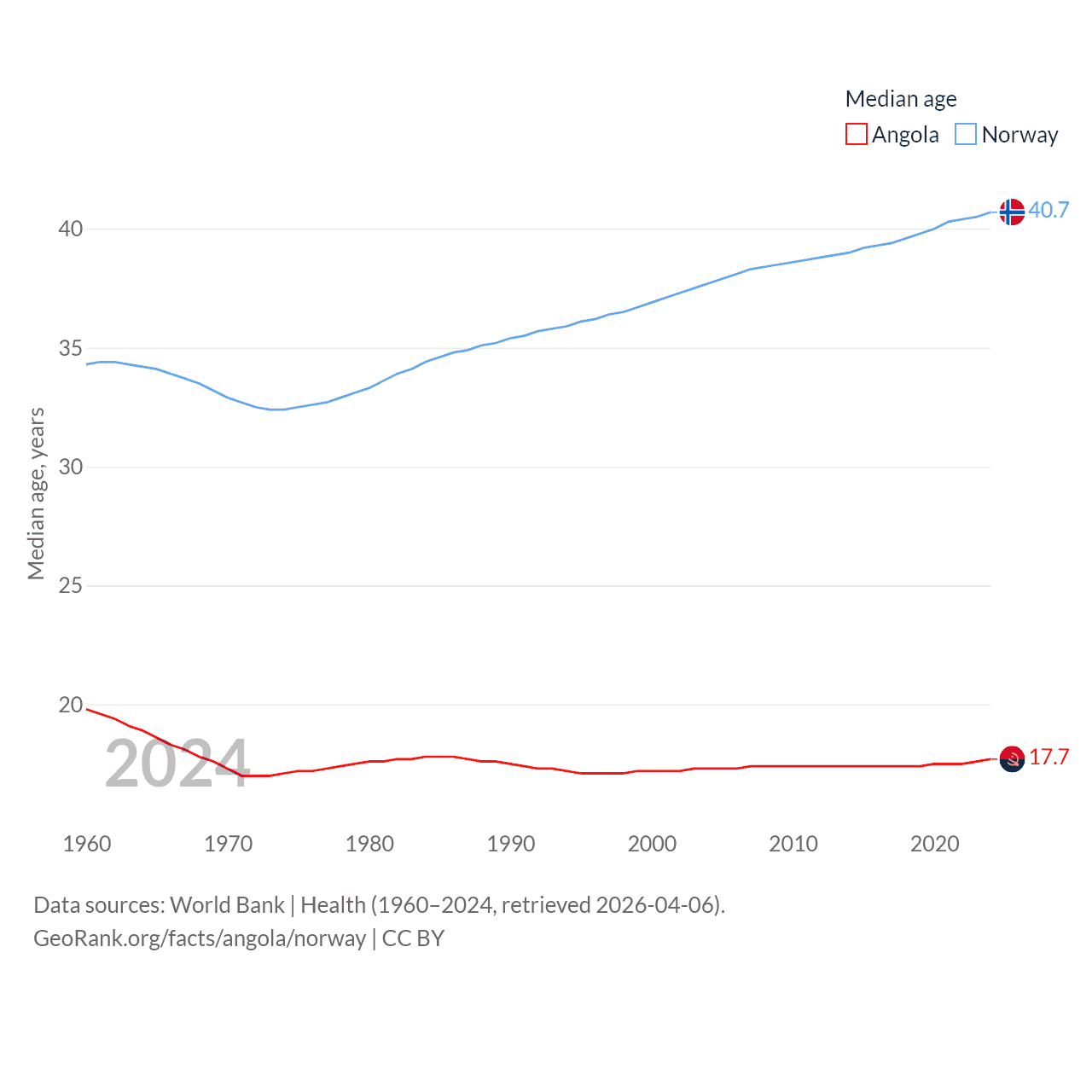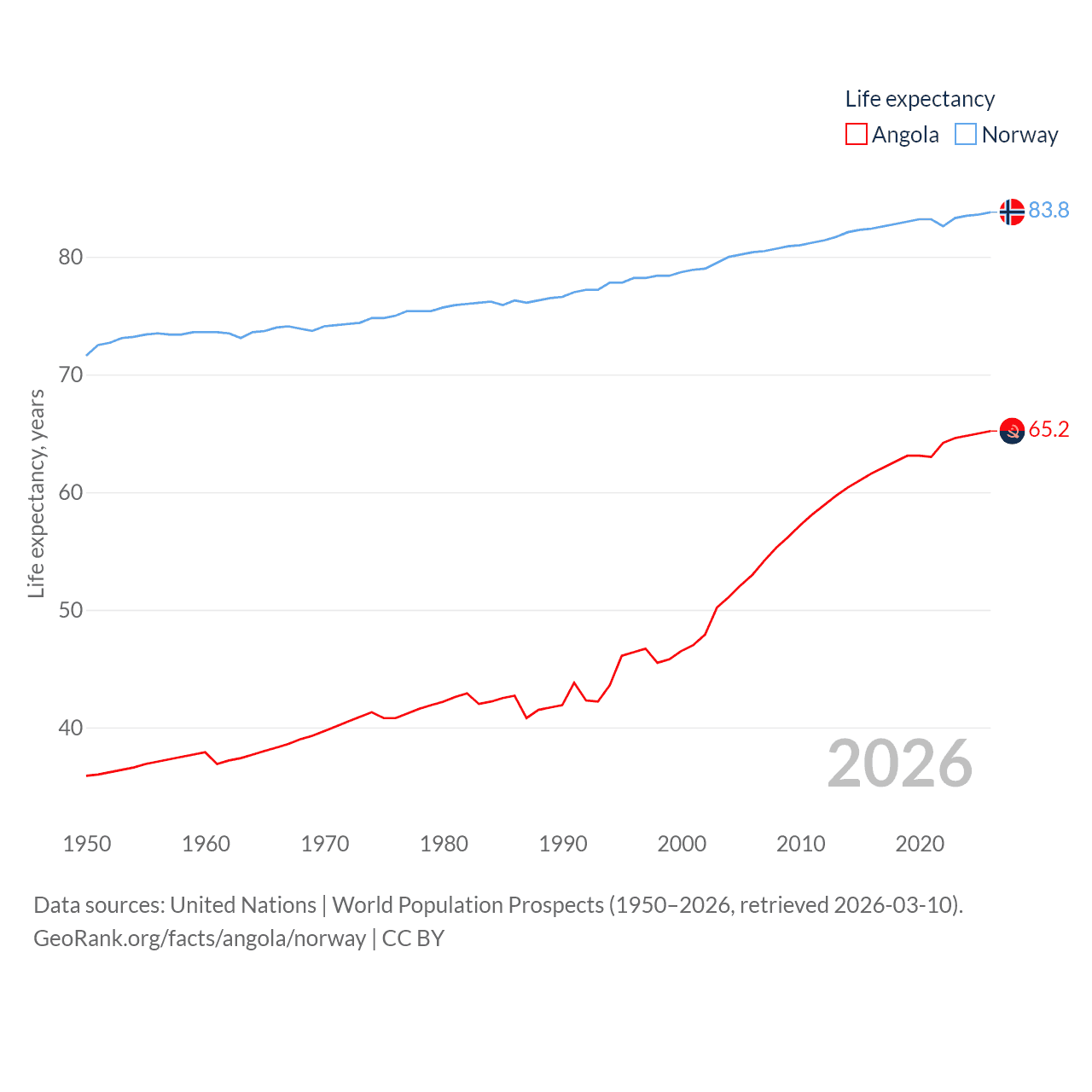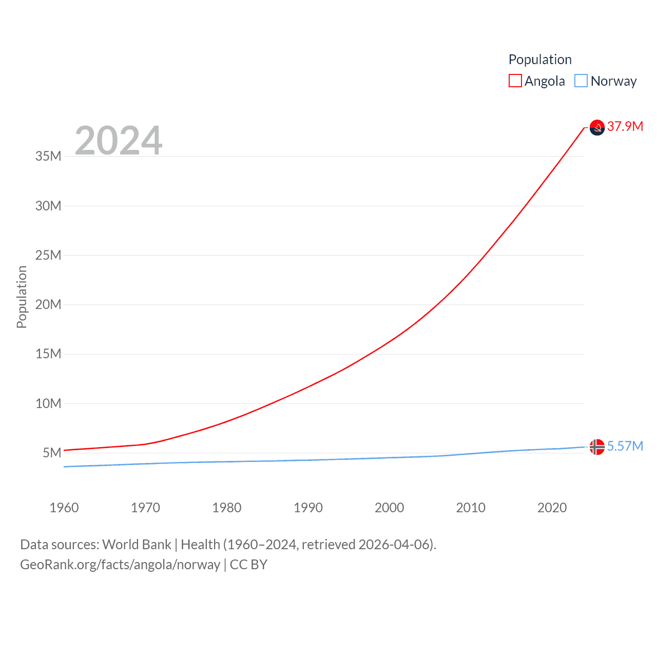 Angola has a population of 37.9M (ranked 40/197), compared with 5.57M in Norway (ranked 118/197). Angola's land area is 481,354 sq mi versus 140,645 sq mi for Norway (ranked 22nd vs. 62nd).
