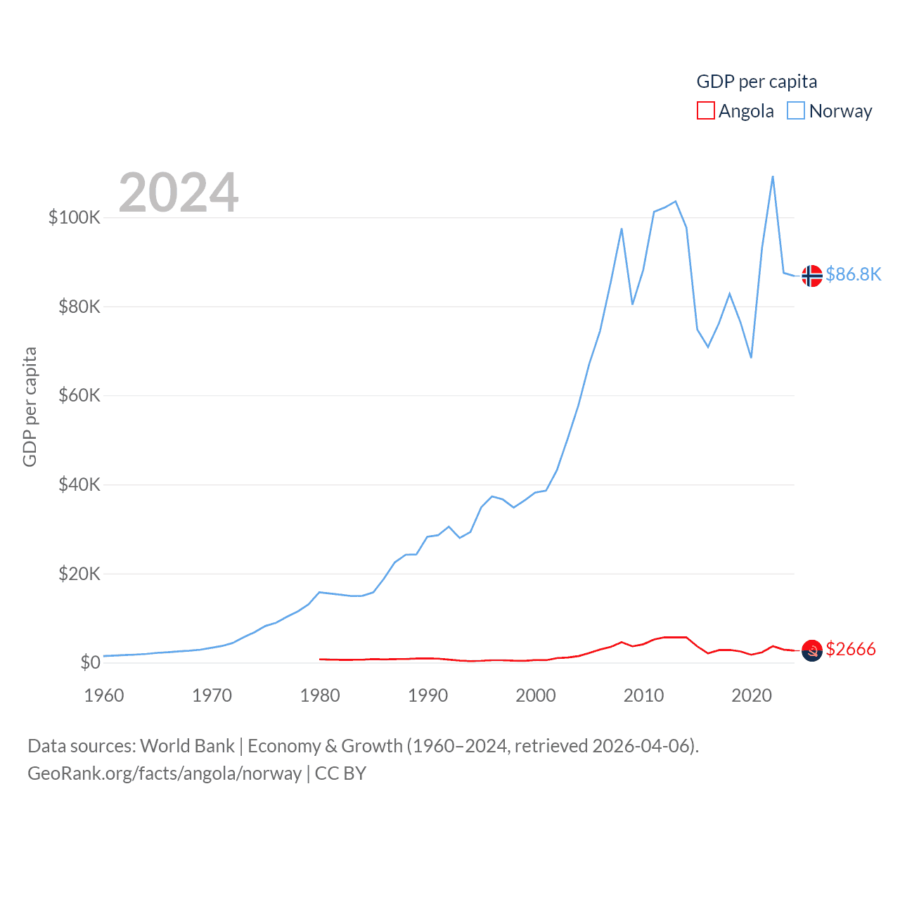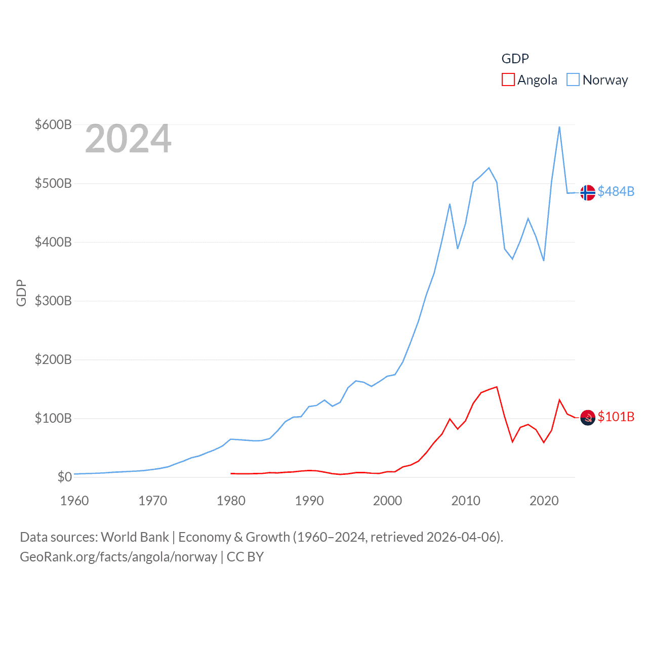By GDP, Angola ranks 71/197 ($101B) and Norway ranks 32/197 ($484B). By GDP per capita, Angola ranks 144/197 ($2,666), while Norway ranks 8/197 ($86,785).