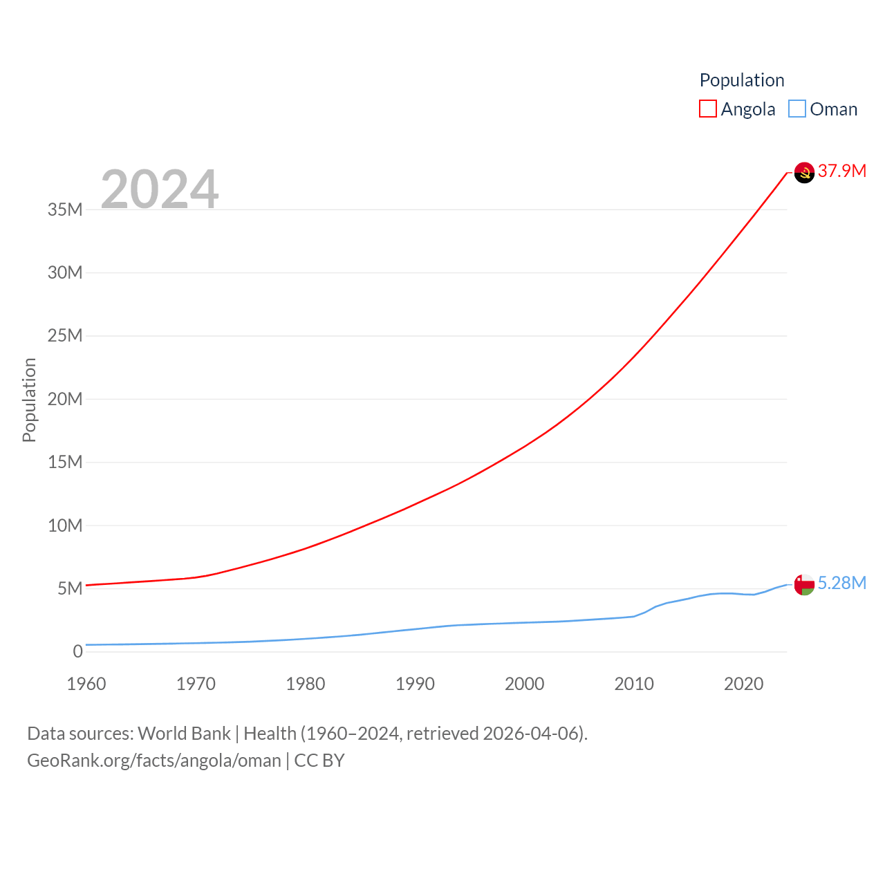 Angola has a population of 37.9M (ranked 40/197), compared with 5.28M in Oman (ranked 124/197). Angola's land area is 481,354 sq mi versus 119,499 sq mi for Oman (ranked 22nd vs. 68th).