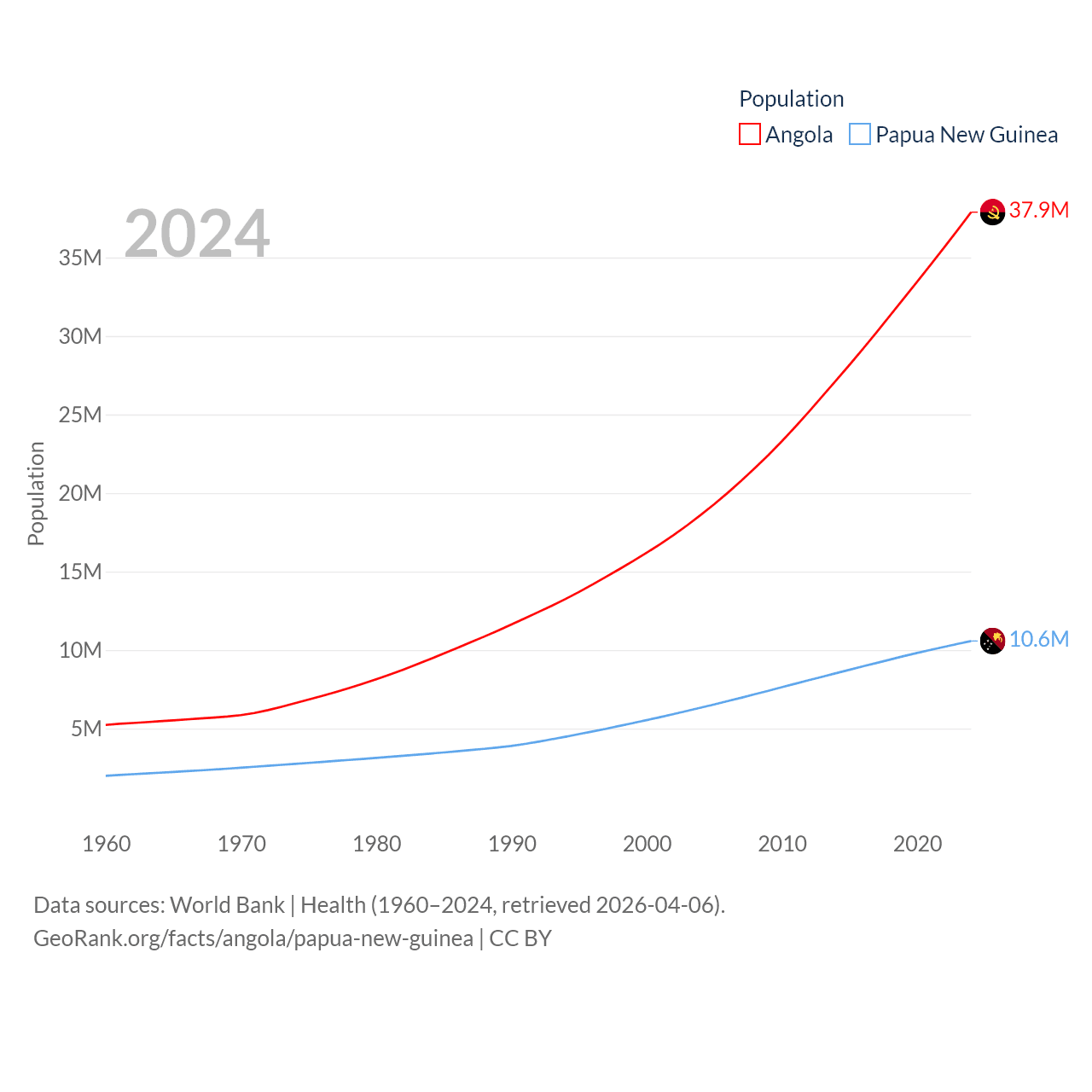Angola has a population of 37.9M (ranked 40/197), compared with 10.6M in Papua New Guinea (ranked 92/197). Angola's land area is 481,354 sq mi versus 174,850 sq mi for Papua New Guinea (ranked 22nd vs. 54th).