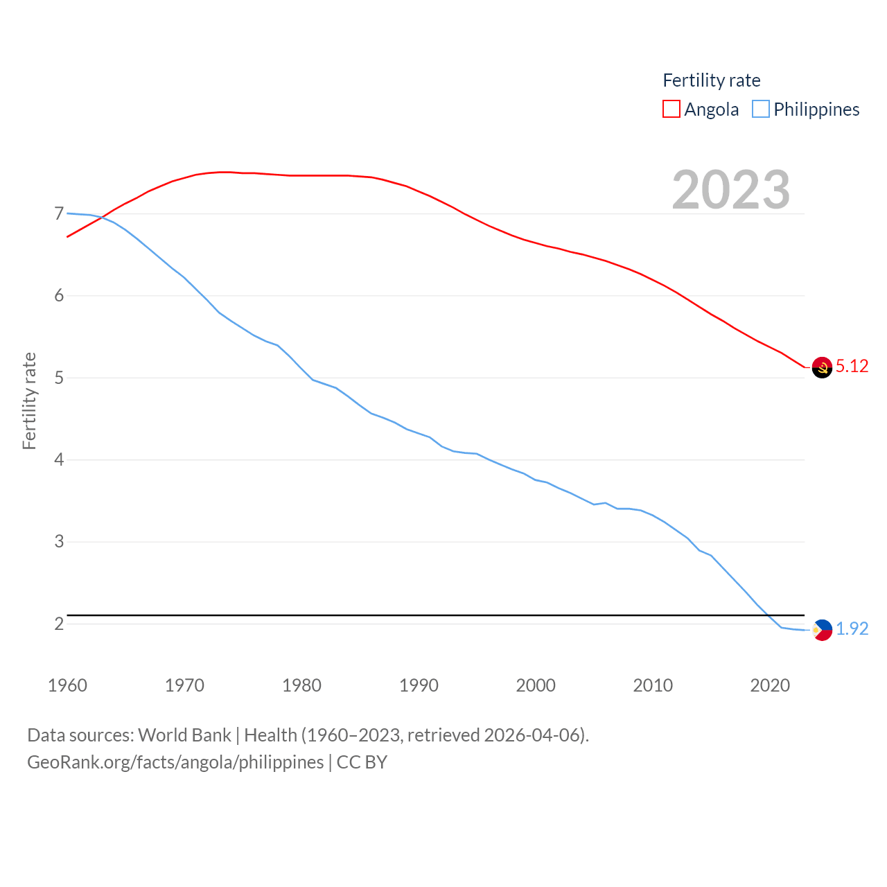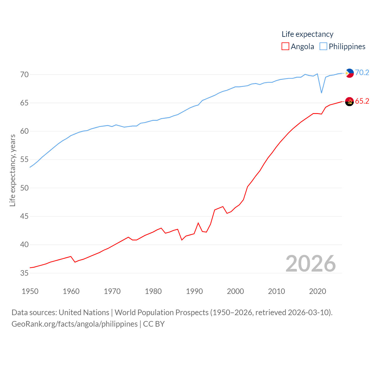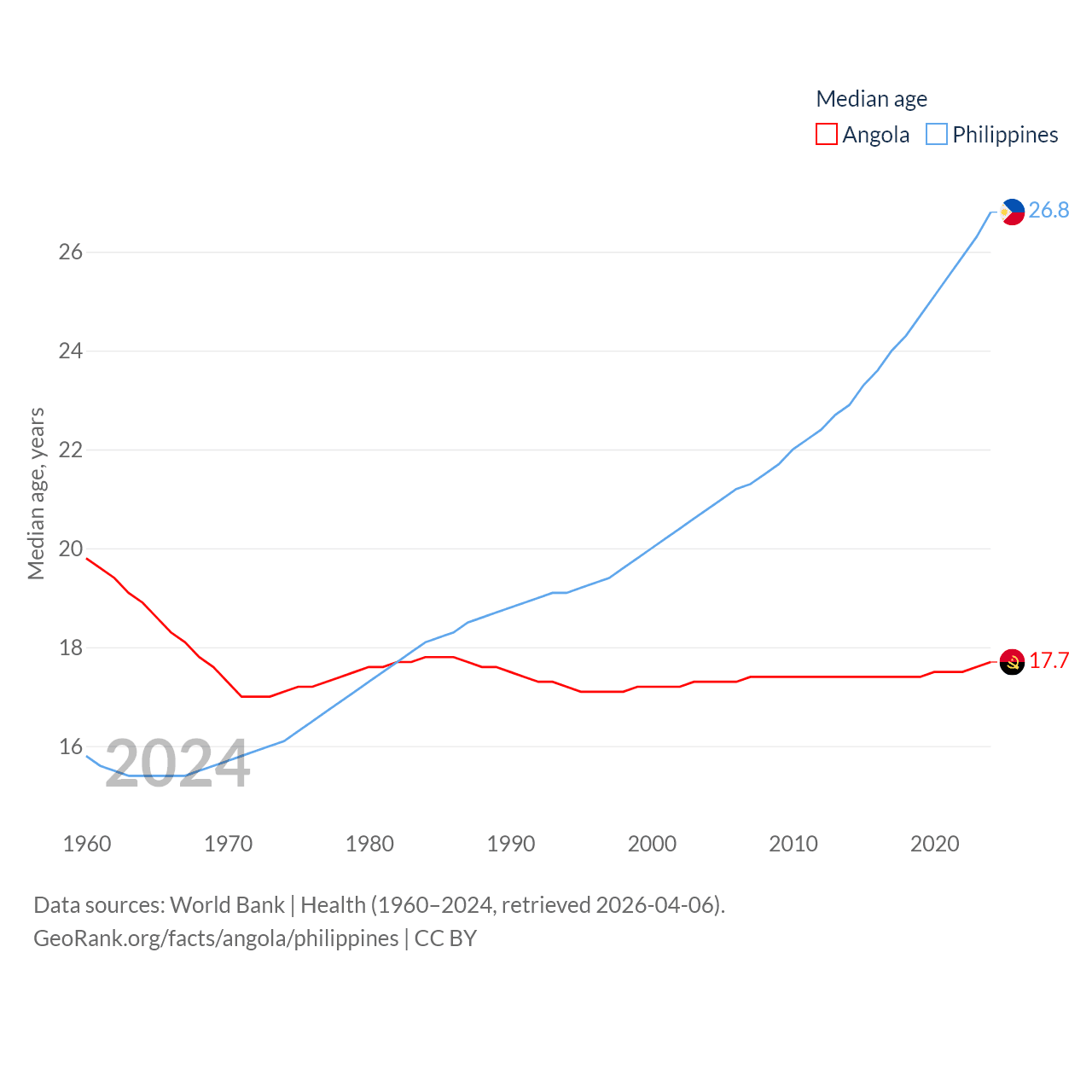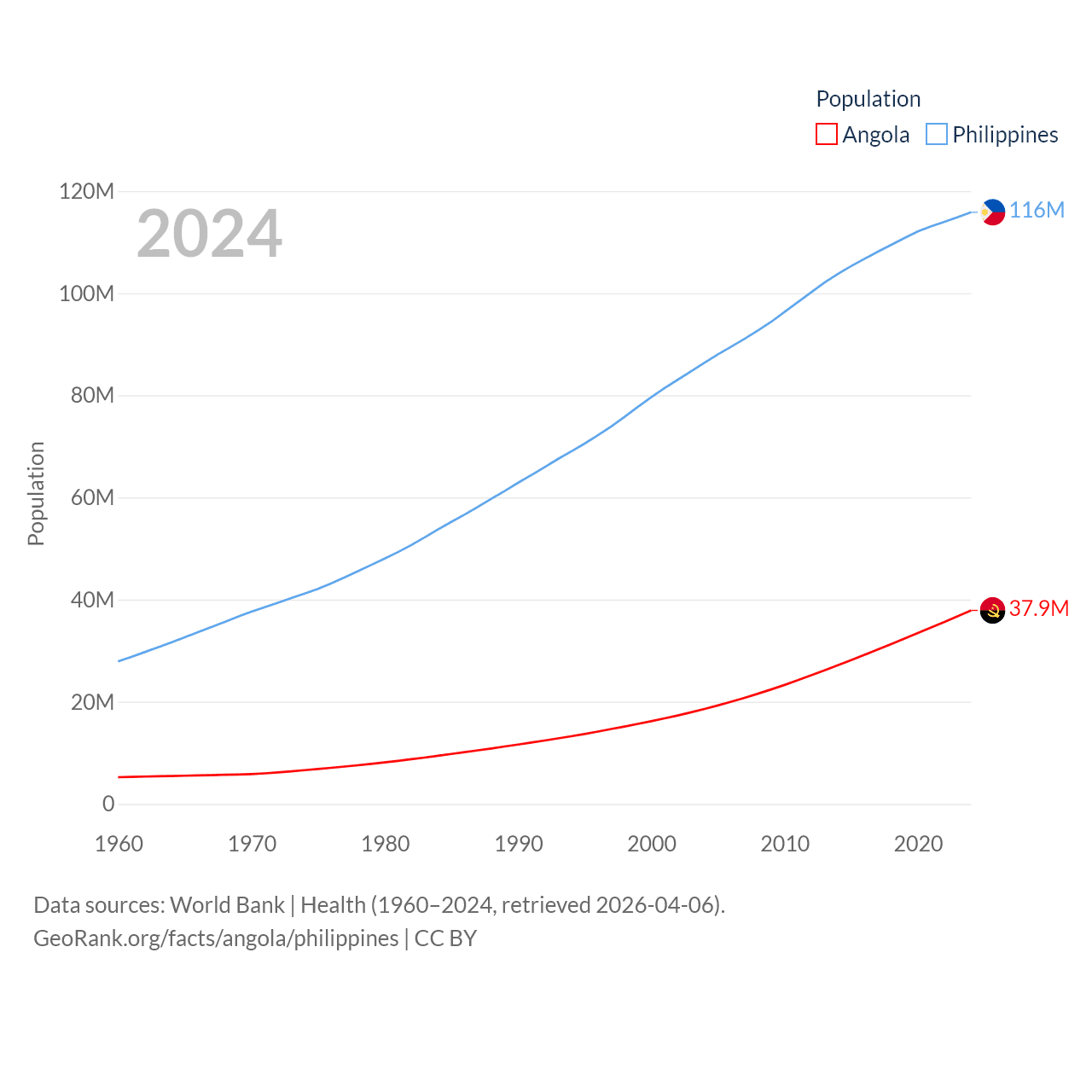 Angola has a population of 37.9M (ranked 40/197), compared with 116M in The Philippines (ranked 14/197). Angola's land area is 481,354 sq mi versus 115,124 sq mi for The Philippines (ranked 22nd vs. 71st).