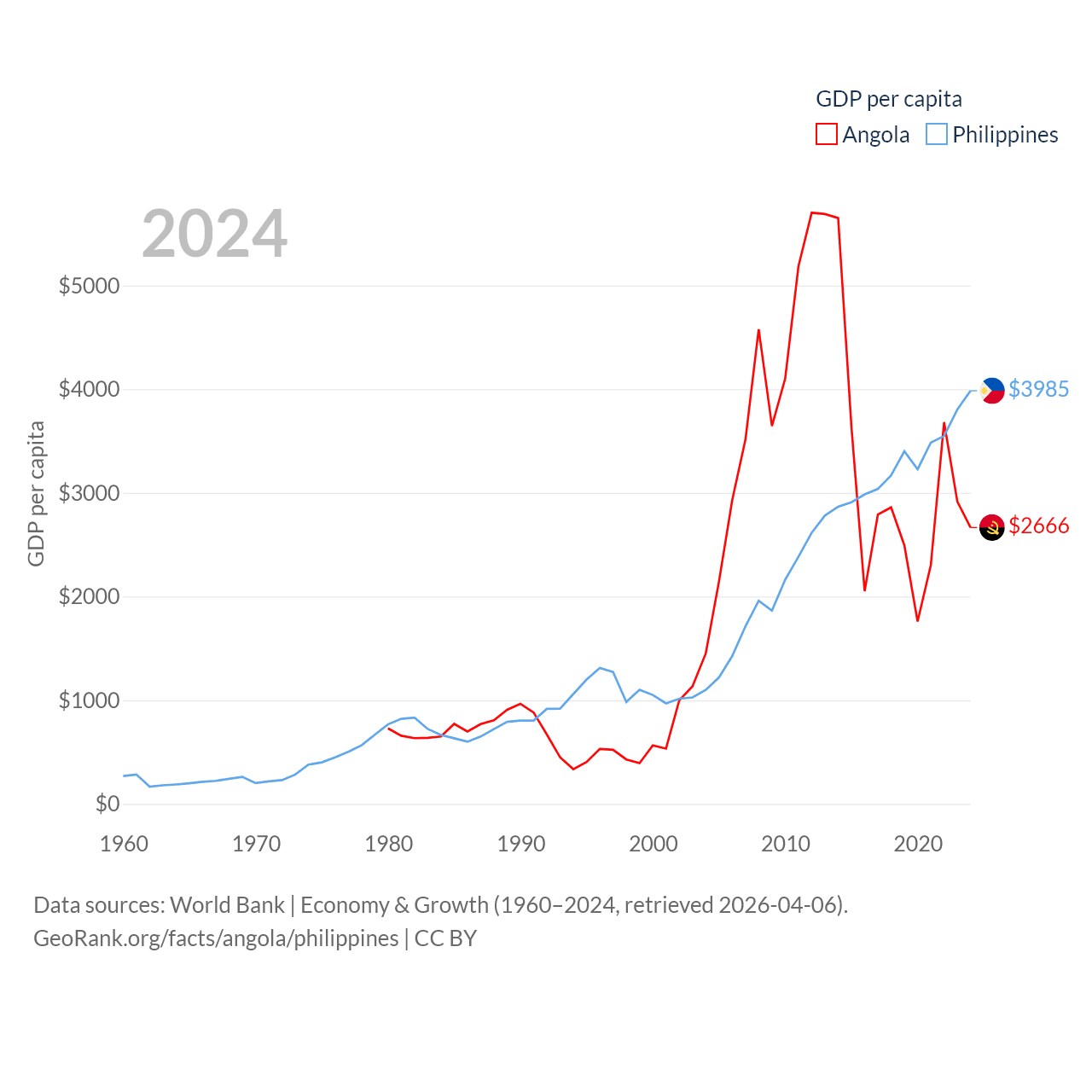 By GDP, Angola ranks 71/197 ($101B) and The Philippines ranks 35/197 ($462B). By GDP per capita, Angola ranks 144/197 ($2,666), while The Philippines ranks 130/197 ($3,985).