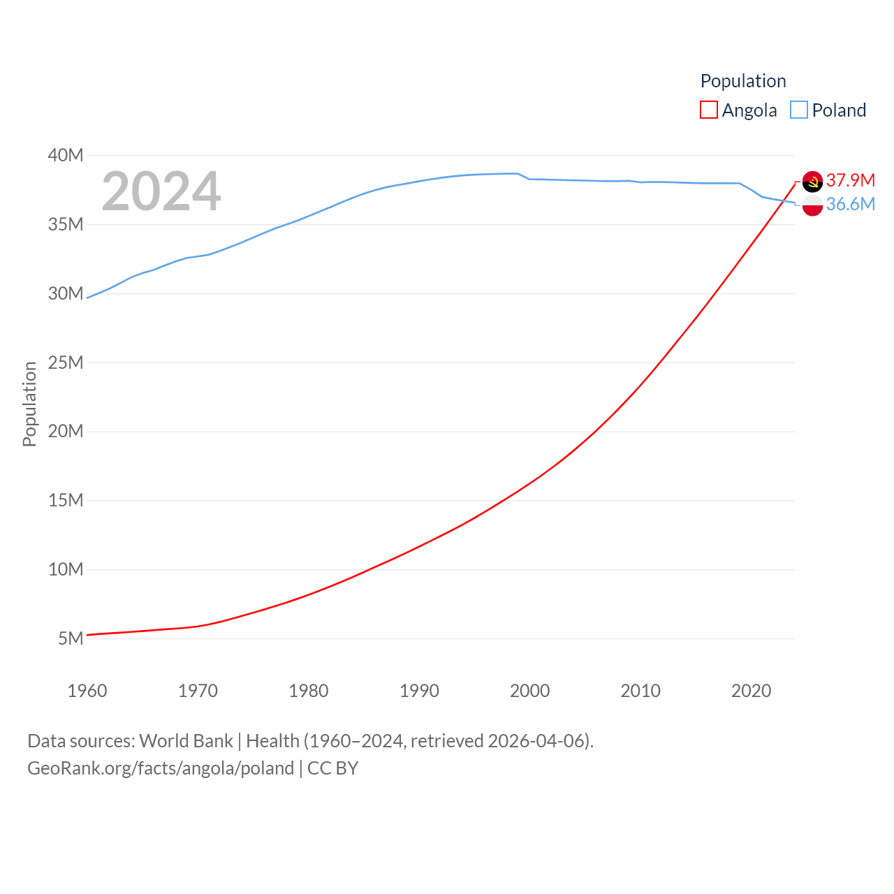 Angola has a population of 37.9M (ranked 40/197), compared with 36.6M in Poland (ranked 42/197). Angola's land area is 481,354 sq mi versus 118,252 sq mi for Poland (ranked 22nd vs. 69th).